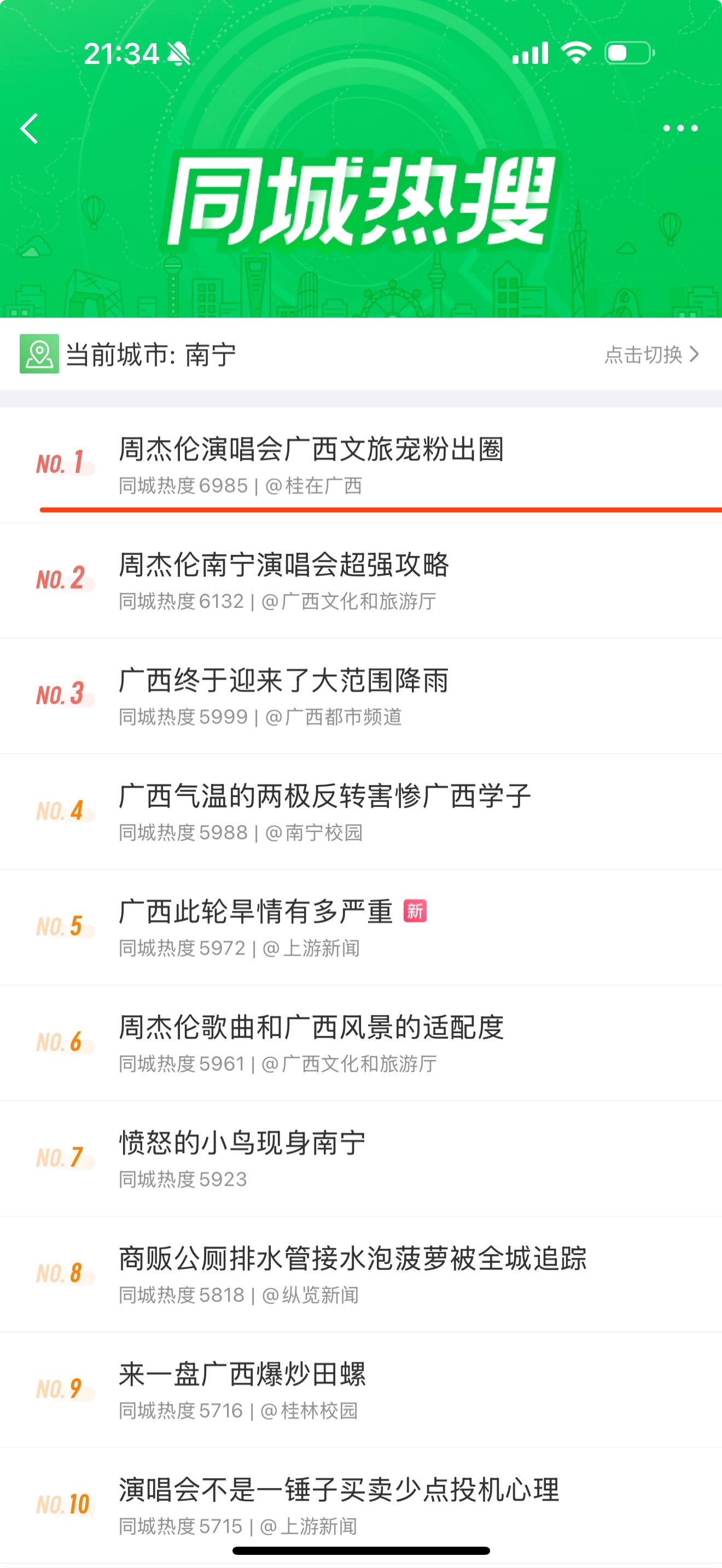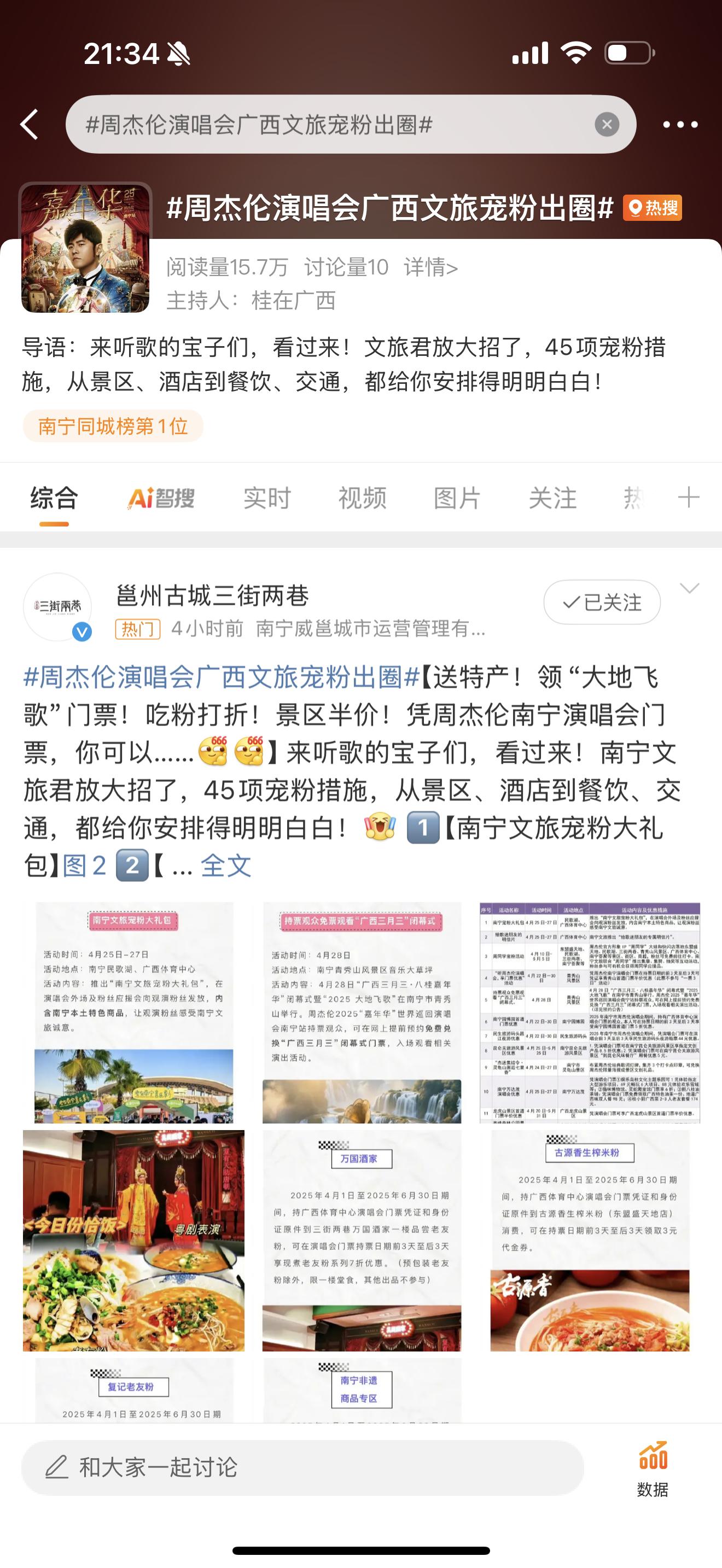 周杰倫南寧演唱會期間,南寧文旅集團充分發揮新媒體宣傳優勢,通過南寧文旅集團、廣西體育中心雙賬號矩陣,6個平臺共發布圖文及視頻58條,累計曝光量超1000萬,互動量4.15萬人次。南寧文旅集團策劃的“周杰倫粉絲禮遇”活動登上新浪微博同城熱搜榜第一名話題“周杰倫演唱會廣西文旅寵粉出圈”的首條推薦位。