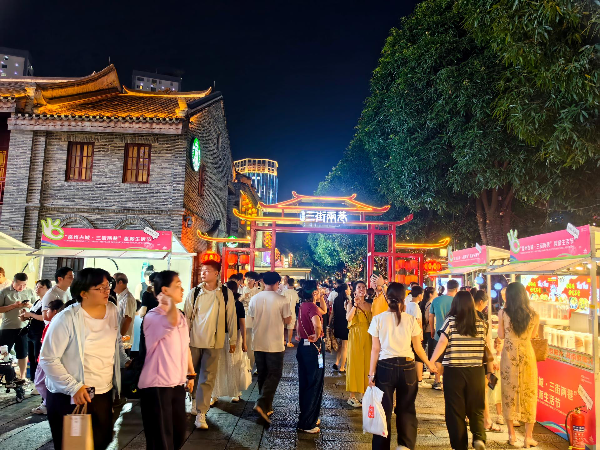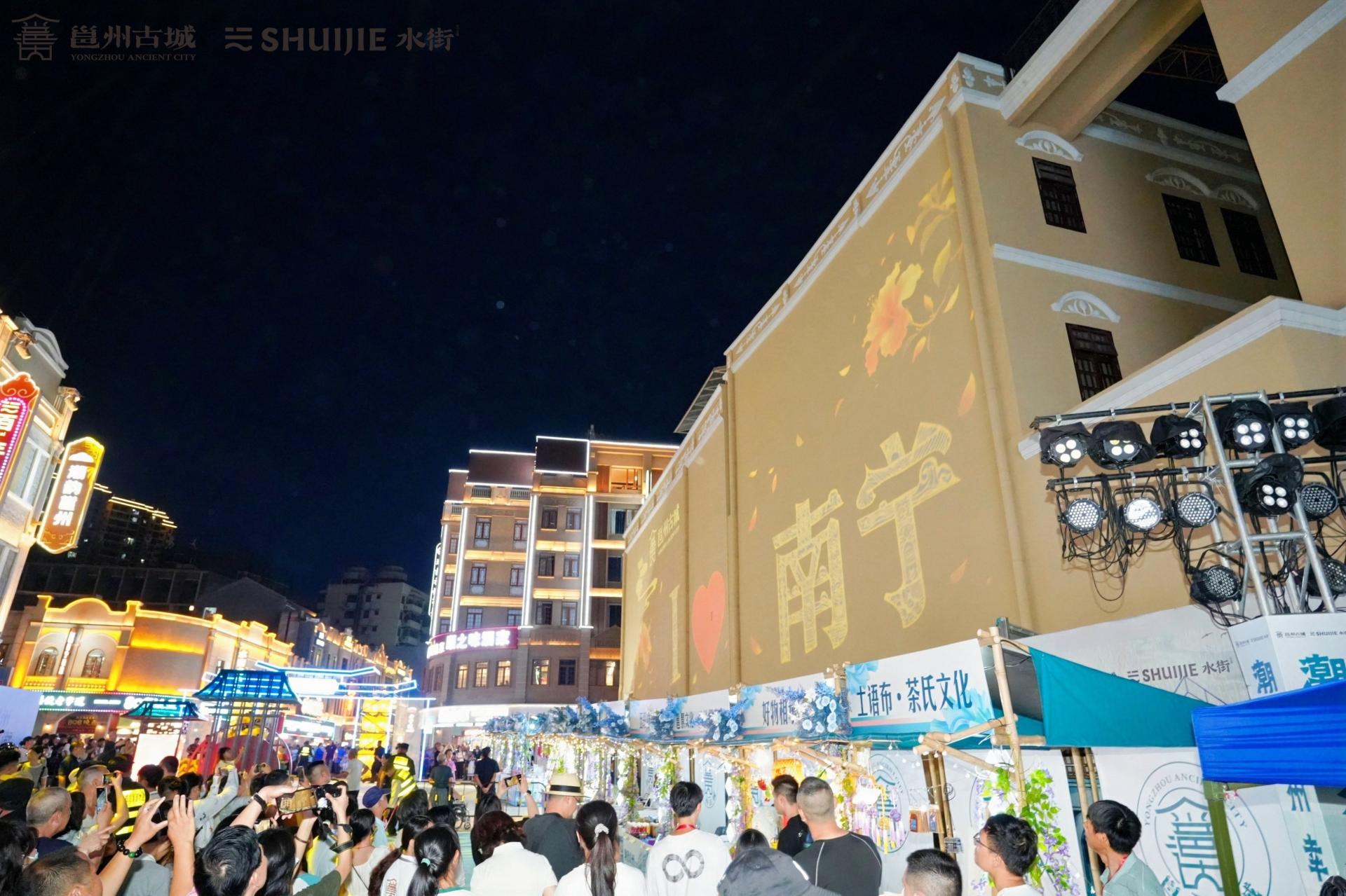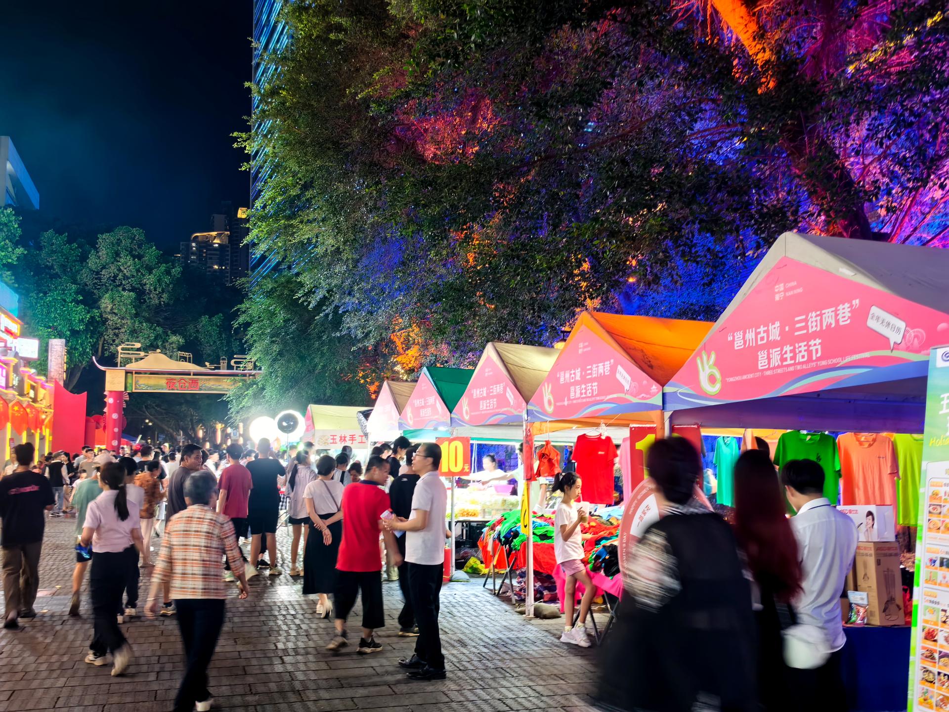 “五一”期間,邕州古城·三街兩巷歷史文化街區邕派生活節活動現場熱鬧非凡,活動中的文創IP市集以一場“治愈大會”為主題成功吸引了眾多市民和游客前來參與,其中,三個活動主場地均設置了如“45°青年”“去打工吧!”等合影打卡墻,并結合一場場治愈音樂會讓每一位游客都能感受到南寧獨特的夜生活多巴胺!據統計,“五一”假期期間三街兩巷接待游客量達43.5萬人次,同比上年同期增長9%,各商戶合計營業額同比上年同期增長約13%。其中,5月1日單日接待游客近10萬人次。