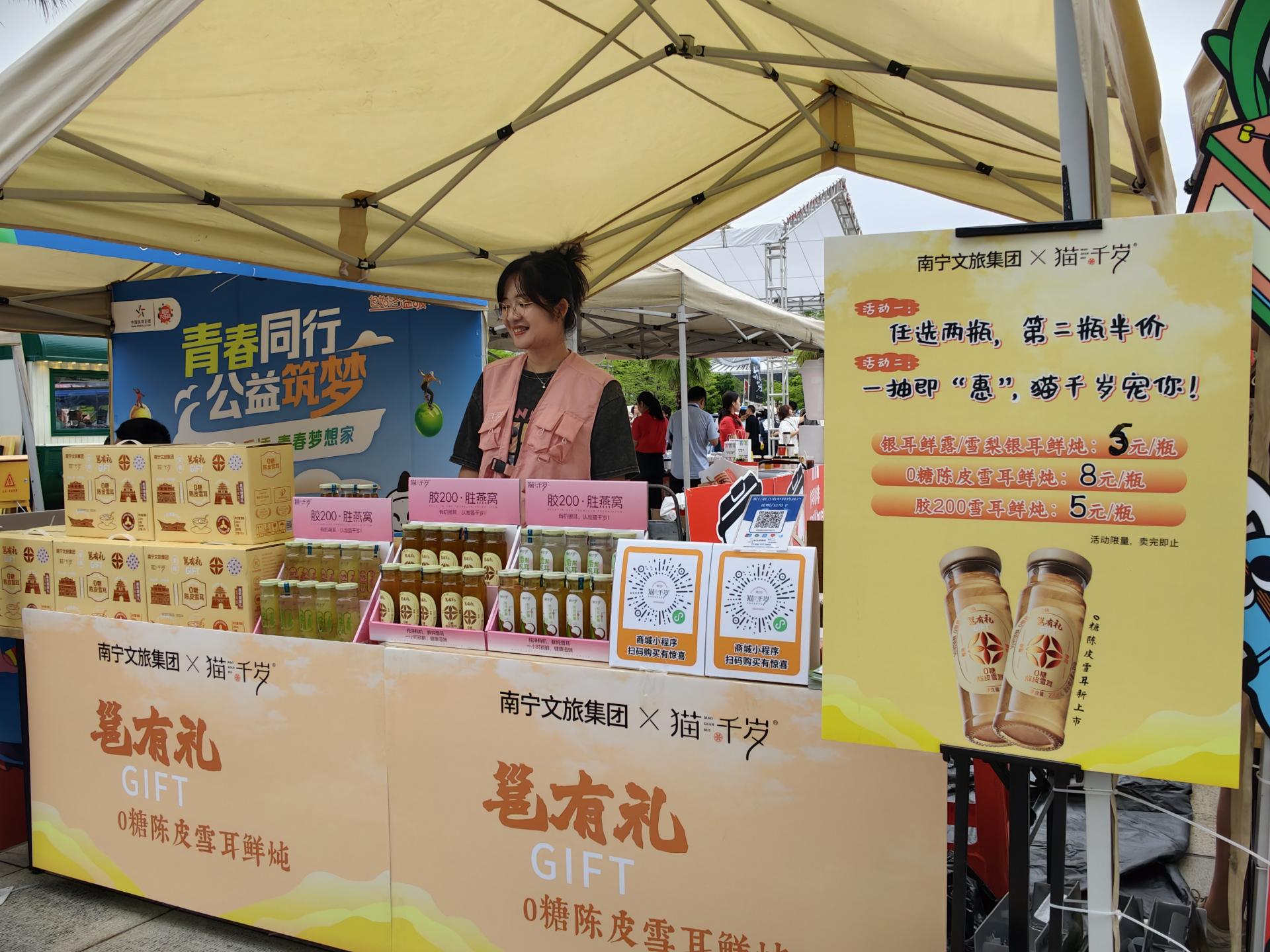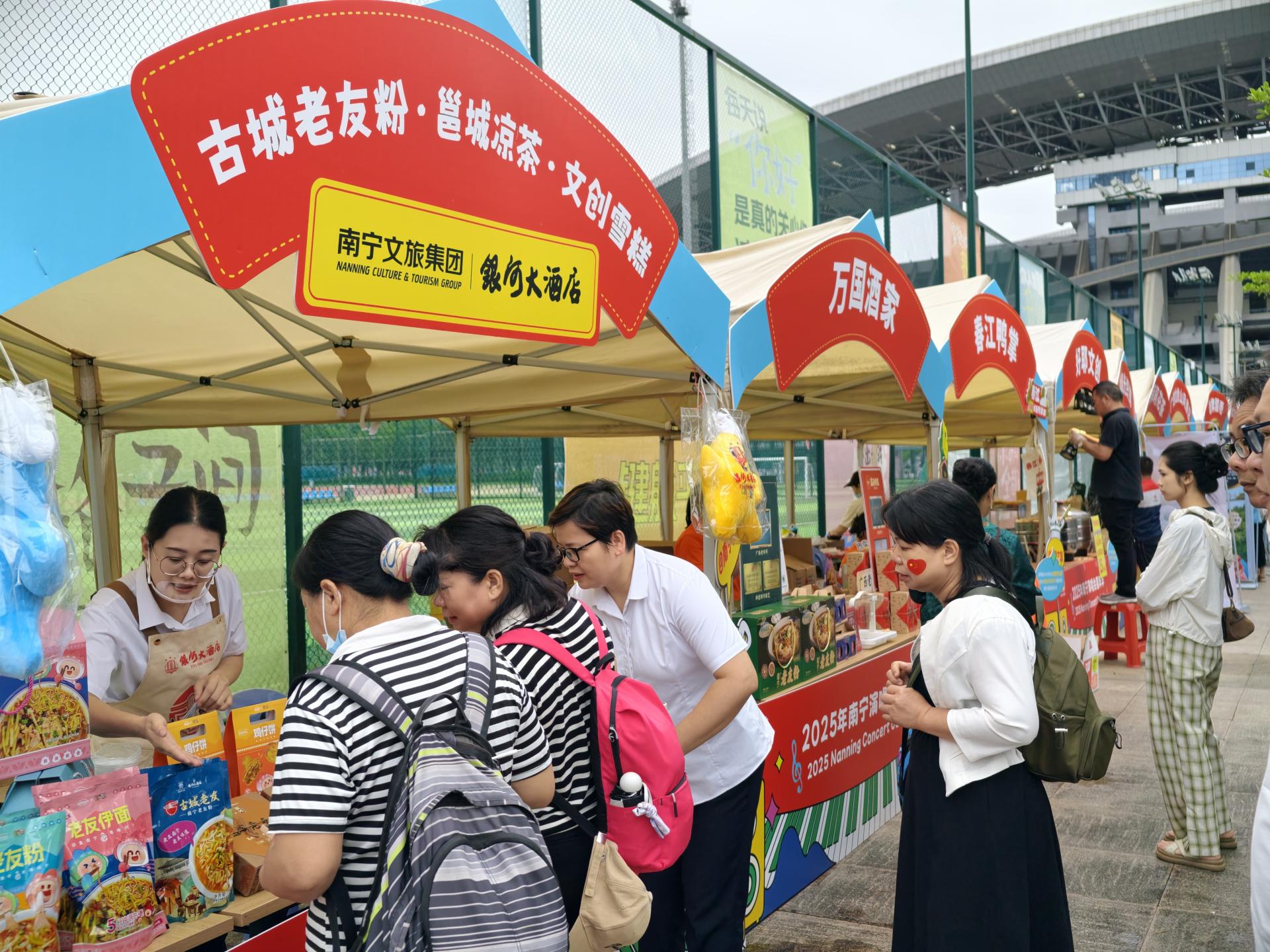 為豐富演唱會(huì)外延體驗(yàn),南寧文旅集團(tuán)精心策劃一系列配套活動(dòng)。在廣西體育中心噴泉廣場(chǎng),打造47個(gè)攤點(diǎn)的廣西非遺特色演唱會(huì)市集。南寧文旅集團(tuán)聯(lián)合貓千歲品牌出品的“邕有禮”銀耳系列好禮成為市集的焦點(diǎn);銀河公司旗下的古城老友粉、邕城涼茶以及文創(chuàng)雪糕讓歌迷們大飽口福,“邕城涼茶”更是連續(xù)兩天在開場(chǎng)前被搶購(gòu)一空;五象山莊在體育館內(nèi)區(qū)域設(shè)立“五象能量站”,提供薄荷檸檬水、凍檸樂、手作軟歐包等,供粉絲進(jìn)行現(xiàn)場(chǎng)的能量補(bǔ)給。據(jù)統(tǒng)計(jì),為期兩天的演出,共吸引3萬(wàn)歌迷體驗(yàn)市集活動(dòng)。