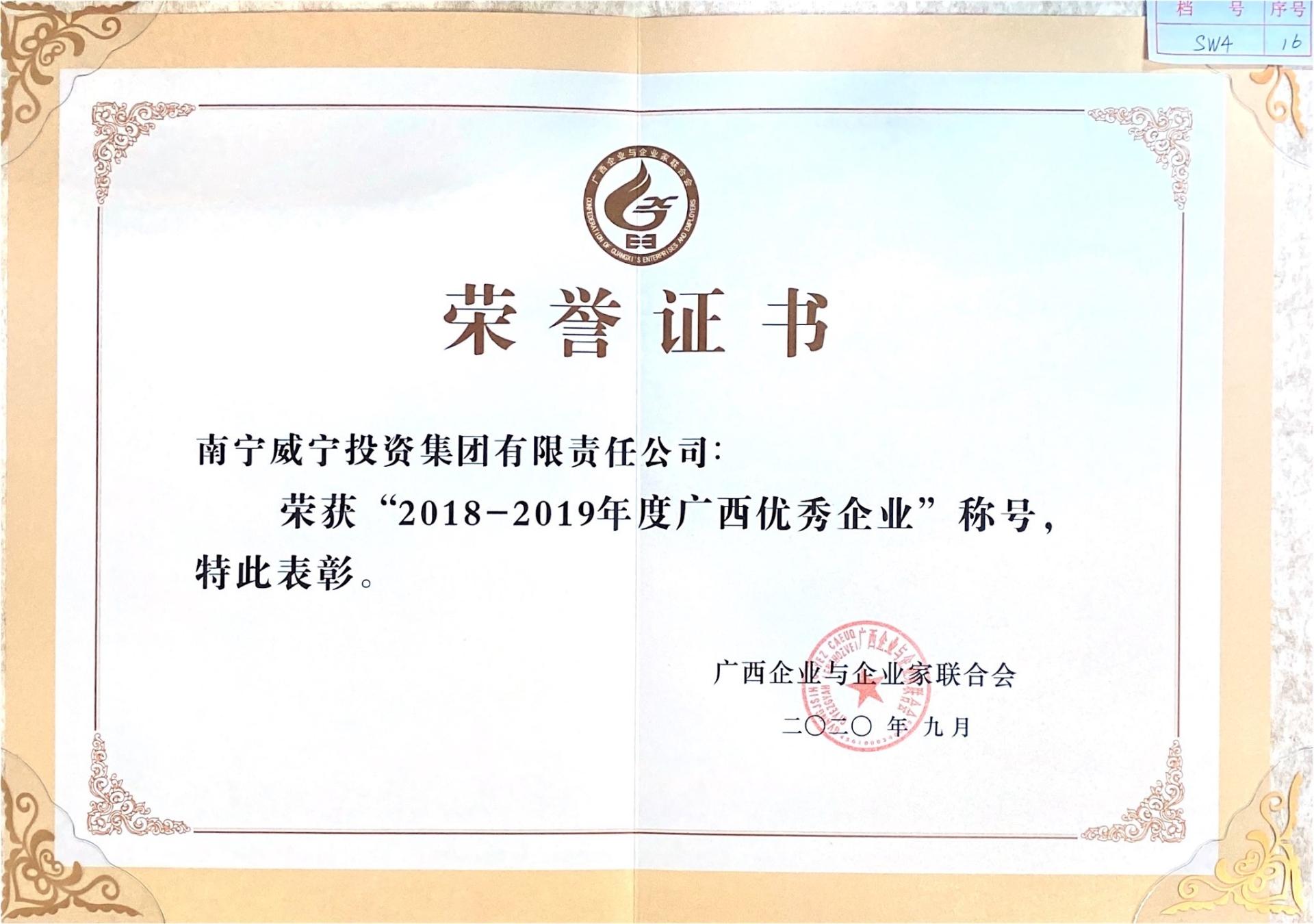 2020年9月,南寧威寧集團榮獲南寧市廣西企業與企業家聯合會授予的“2018-2019年度優秀企業”榮譽證書