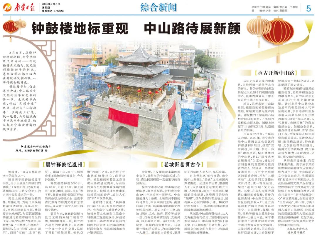 2024年2月8日臘月二十八晚,南寧重磅級文旅地標——中山路鐘鼓樓正式亮燈,年味從高掛在鐘鼓樓上的大紅燈籠的光亮中流淌出來,拉開了邕州古城新年系列活動的序幕。正月初一至十五在邕州古城·三街兩巷舉辦的2024年南寧城隍廟會暨邕州古城新春國風家年華活動,更是以打造城市級文化活動IP為目標,以“邕州古城 龍行賀新”為主題,將新春節慶活動、民俗及非遺文化等內容深度融合,通過城隍廟會、三大主題巡游、主題藝術展、新春游園會等系列活動吸引市民和游客在邕州古城度過具有南寧本地特色的中國年。