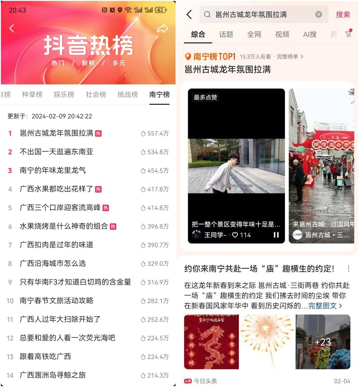 春節期間,邕州古城·三街兩巷抖音賬號對中山路鐘鼓樓亮燈、南寧城隍廟會祥龍瑞獅祈福巡游、財神納福巡游開啟現場直播,三場直播純自然流曝光量超50萬,點贊量超12萬,累計超15萬網友通過抖音平臺觀看了邕州古城春節系列活動。在千萬網友的關注中,“南寧鐘鼓樓重現500年前雄姿”的微博話題登上了新浪微博南寧同城榜第二?!扮咧莨懦驱埬攴諊瓭M”的話題就以超539萬的熱度登上抖音南寧同城榜TOP1,從年三十到正月初一,持續霸榜2天。邕州古城·三街兩巷抖音號春節相關話題視頻亦登上抖音南寧榜TOP1。此外,多位百萬級抖音文旅達人發布視頻推薦春節到邕州古城游玩攻略,全網市民自發發布相關視頻超9000條,話題包括“南寧鐘鼓樓亮燈” “太適合拍全家福了” “三街兩巷集章攻略”等,全網互動聲量超1000萬,全網曝光率超3億次,2024年南寧邕州古城春節活動火爆出圈。
