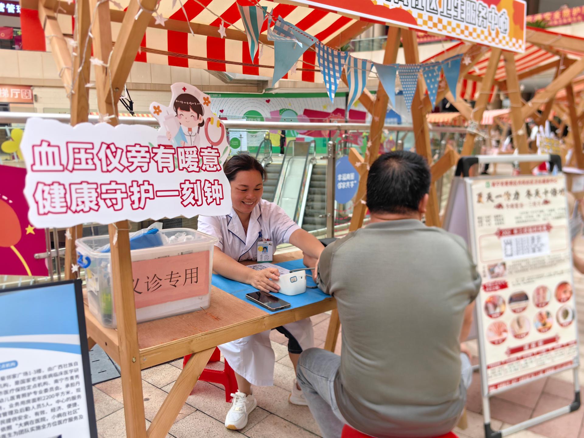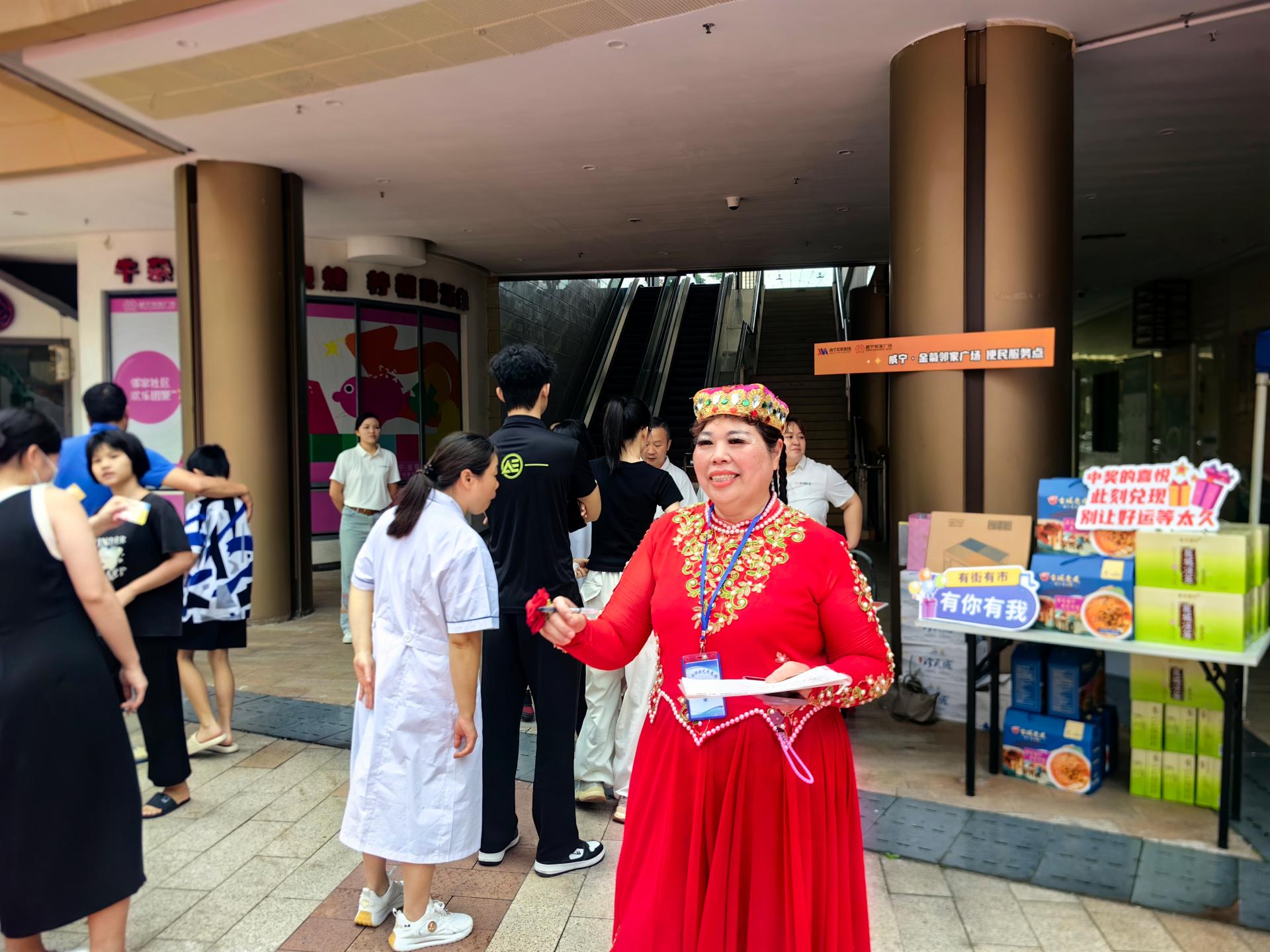 舞臺上熱鬧不停,臺下市集更是人氣爆棚。瑤長府的油茶攤前,不到1小時就送出近100碗熱乎油茶,濃郁香氣里飄著鄰里間的寒暄;安恩寶月子中心的免費三伏貼攤位前,寶媽們排起長隊,老人們也來咨詢養生知識,“一老一小”的關懷在這里悄悄流動;桂墾食堂的套圈游戲前,大人孩子齊上陣,套中廣西香米的居民舉著獎品笑稱“這是一刻鐘生活圈的第一份收獲”。