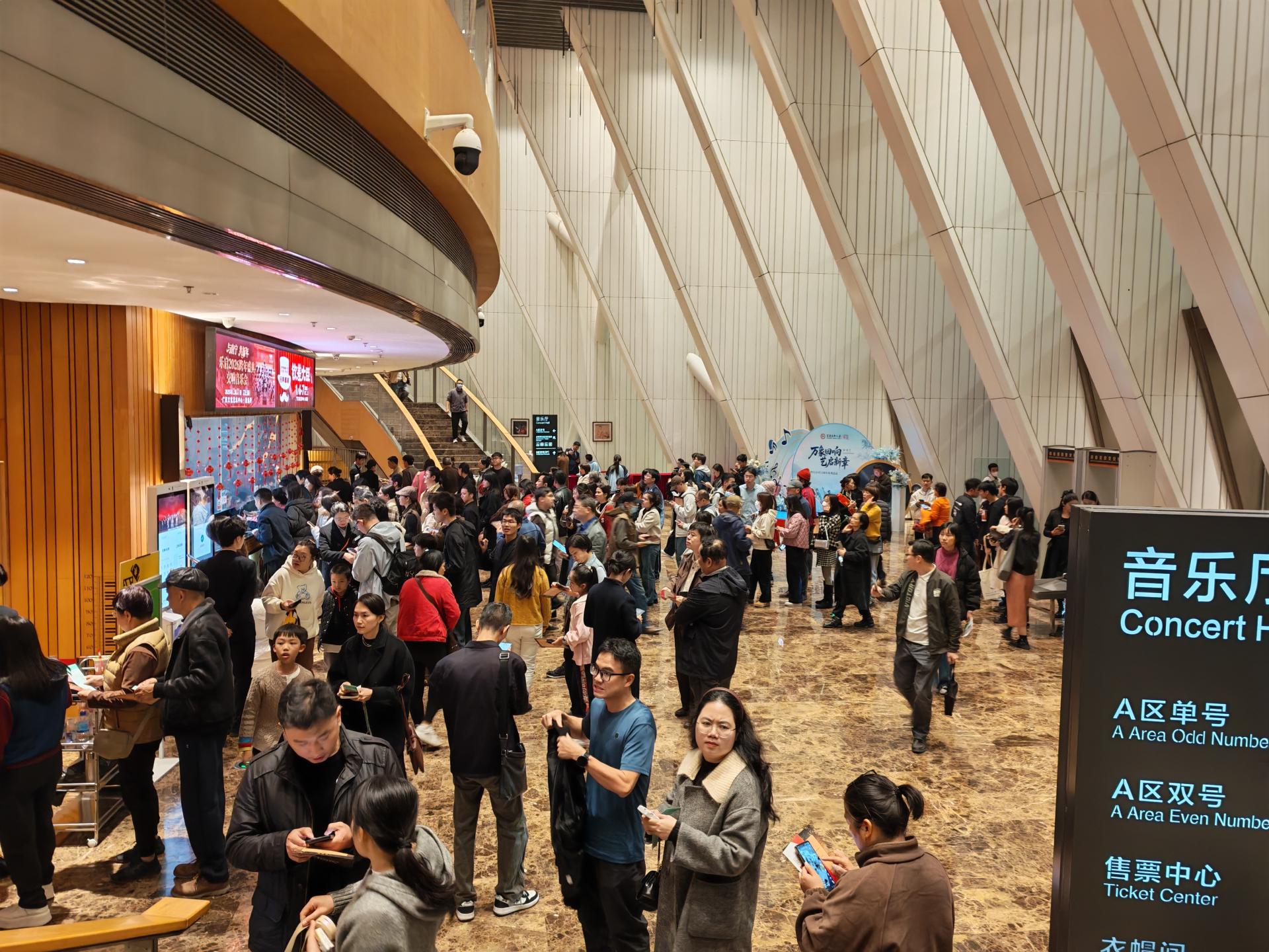 本次跨年盛典在呈現高水平音樂演出的基礎上,同步規劃了多元化配套服務體系。音樂廳入口區域,跨年主題市集、新春打卡展板與品牌文化宣傳展板有機融合、相映成趣,為現場觀眾營造了沉浸式藝術體驗場景;針對VIP 觀眾,專屬休息區同步開放,在悠揚背景音樂的烘托下,五象山莊定制的時令鮮果、精致冷盤及特調飲品供其品鑒,讓觀眾沉浸式感受雅致從容的觀演體驗;面向二等票觀眾,簡餐區提供舒適休憩空間,五象山莊供應的豐富簡餐、特色飲品及精致小食,全面滿足觀演前后的能量補給與休憩需求。零點鐘聲臨近,千余名觀眾與樂團指揮共同倒計時,齊聲高喊 “新年快樂”,音樂廳內禮花絢爛綻放,將跨年喜慶氛圍推向峰值,使本次音樂會成為兼具藝術質感與情感共鳴的年度文化盛事記憶。