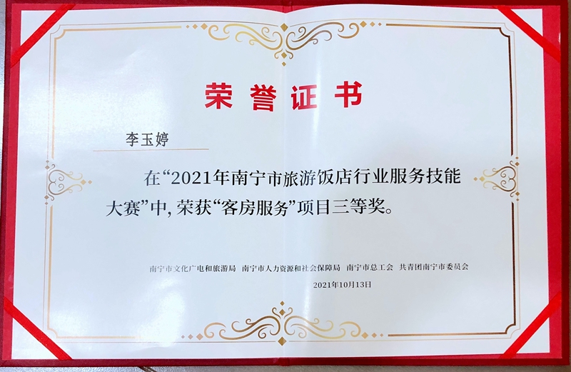 近日,銀河大酒店在由南寧市文化廣電和旅游局、人力資源和社會(huì)保障局、市總工會(huì)、共青團(tuán)南寧市委員會(huì)共同主辦的2021年南寧市旅游飯店行業(yè)服務(wù)技能大賽中榮獲最佳組織獎(jiǎng),客房部員工李玉婷獲客房服務(wù)項(xiàng)目三等獎(jiǎng)。
