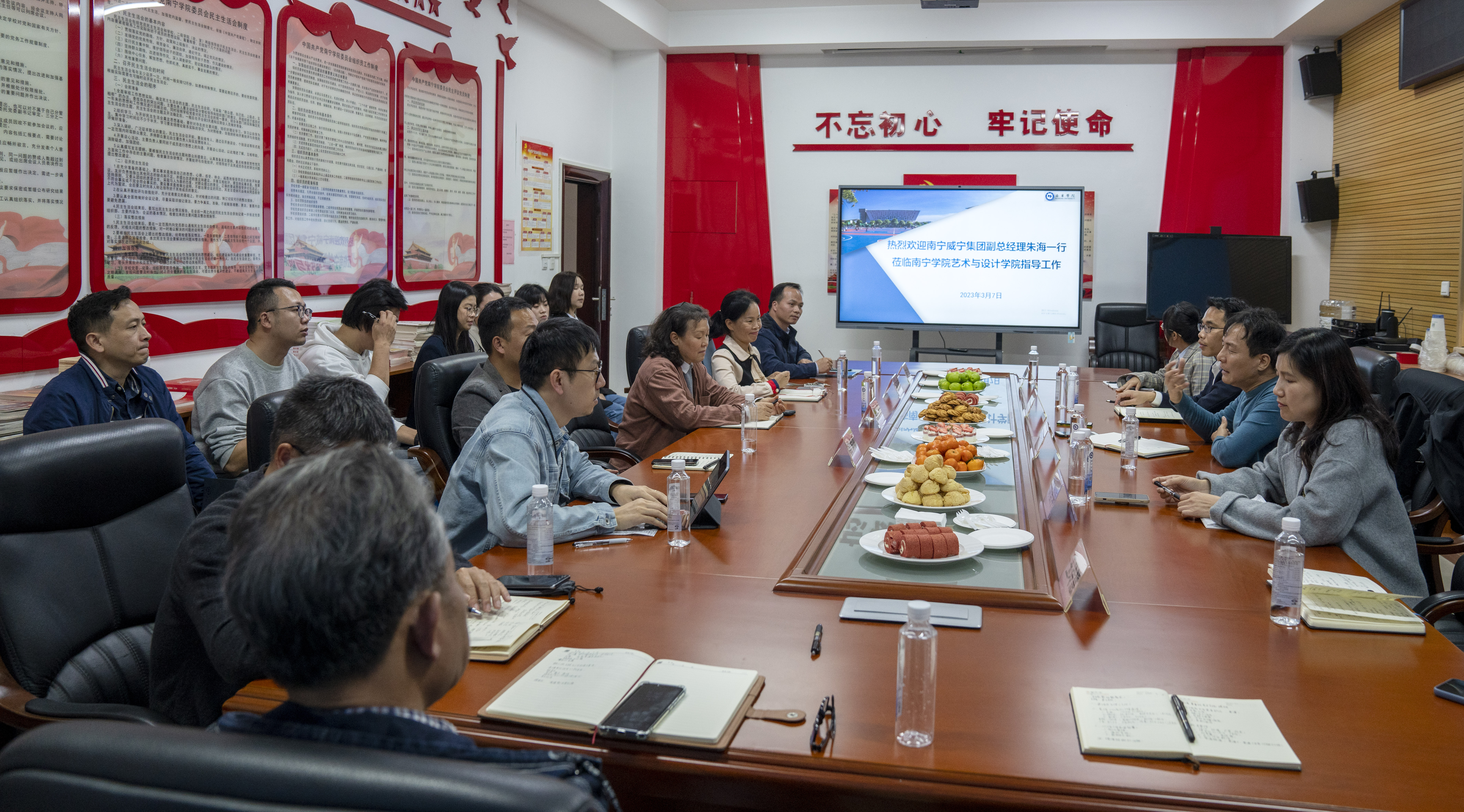 隨后,朱海一行與南寧學院相關領導及藝術與設計學院部分教師骨干召開座談會,并就南寧學院藝術與設計學院校企合作項目展開深入研討。座談會上,朱海表示,威寧酒店公司近年來持續優化經營布局,加大加快新業態培育,強化文化賦能,積極探索新的經營增長點,力求為公司高質量發展注入新動能、新活力。希望通過溝通交流,雙方能進一步在校企合作方面打好合作共贏的“組合拳”,共同推動特色課程開發、人才培養、藝術作品落地門店等方面達成更多深層次的合作,取得更多實質性成果。