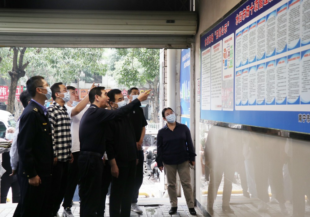 調研中,考察組深入水街市場各行業,實地了解市場標準化升級改造、市場水產區及活禽宰殺區三區分離設置、農殘快速檢測、市場環境整治及創衛氛圍營造等工作開展情況,仔細查看水街市場創衛工作臺賬及記錄,并圍繞水街市場創衛工作特色經驗、亮點舉措及長效化管理機制與市場負責人進行深入交流探討。