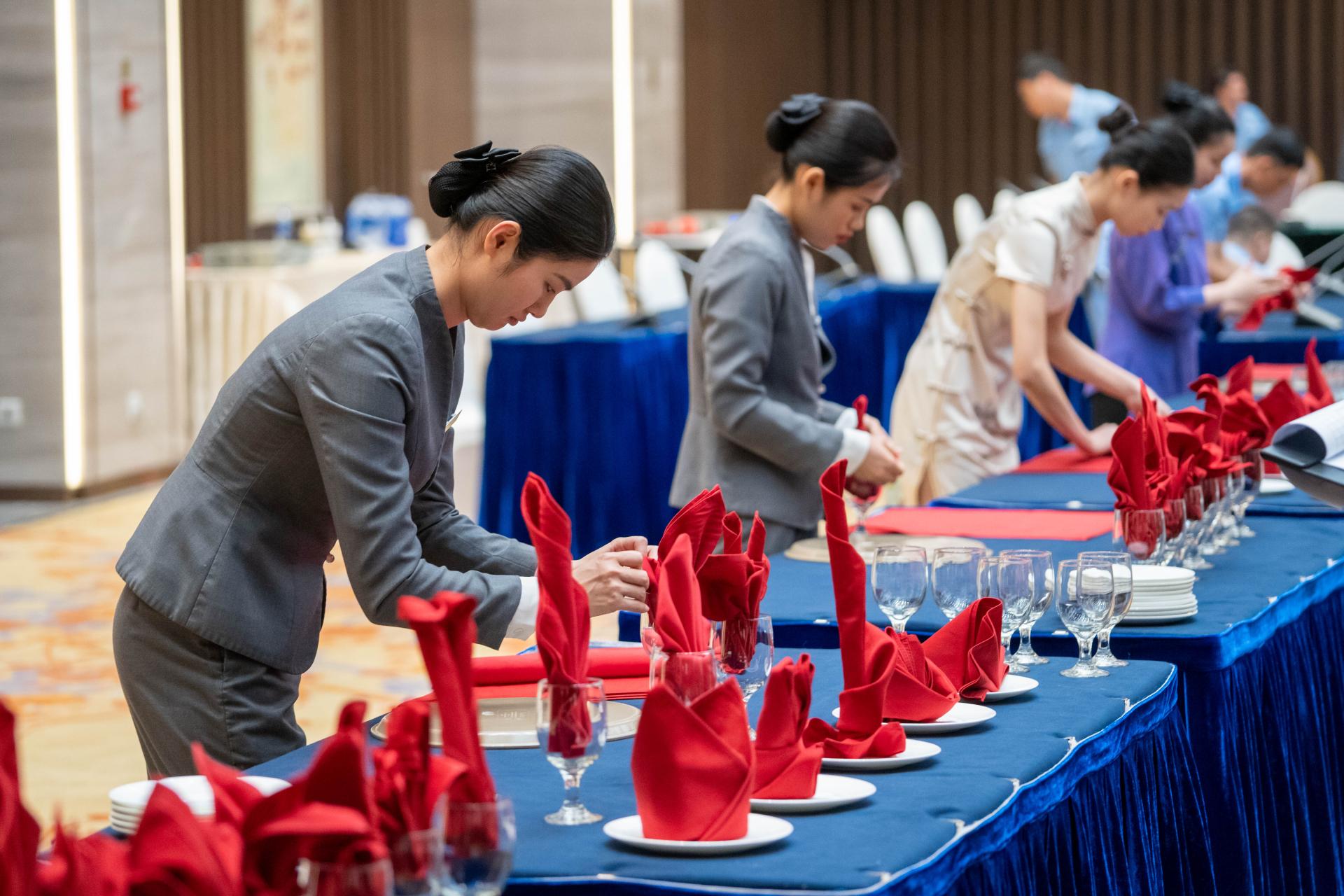 疊、折、卷、穿、拉、掰……選手們動作敏捷、快速利落。2023年5月6日下午,在五象山莊11號樓大宴會廳,來自安保部“車輛指揮手勢”才藝匯演,房務部“我型我秀——吉他彈唱”火熱拉開了五象山莊2023年員工趣味技能競賽活動帷幕,來自各部門11位員工進行才藝展示,90位選手參加技能競賽,將酒店服務的“工匠精神”,展現得淋漓盡致,營造出“比、學、趕、幫、超”的濃厚氛圍。