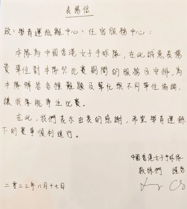 中國香港女子手球隊表揚信