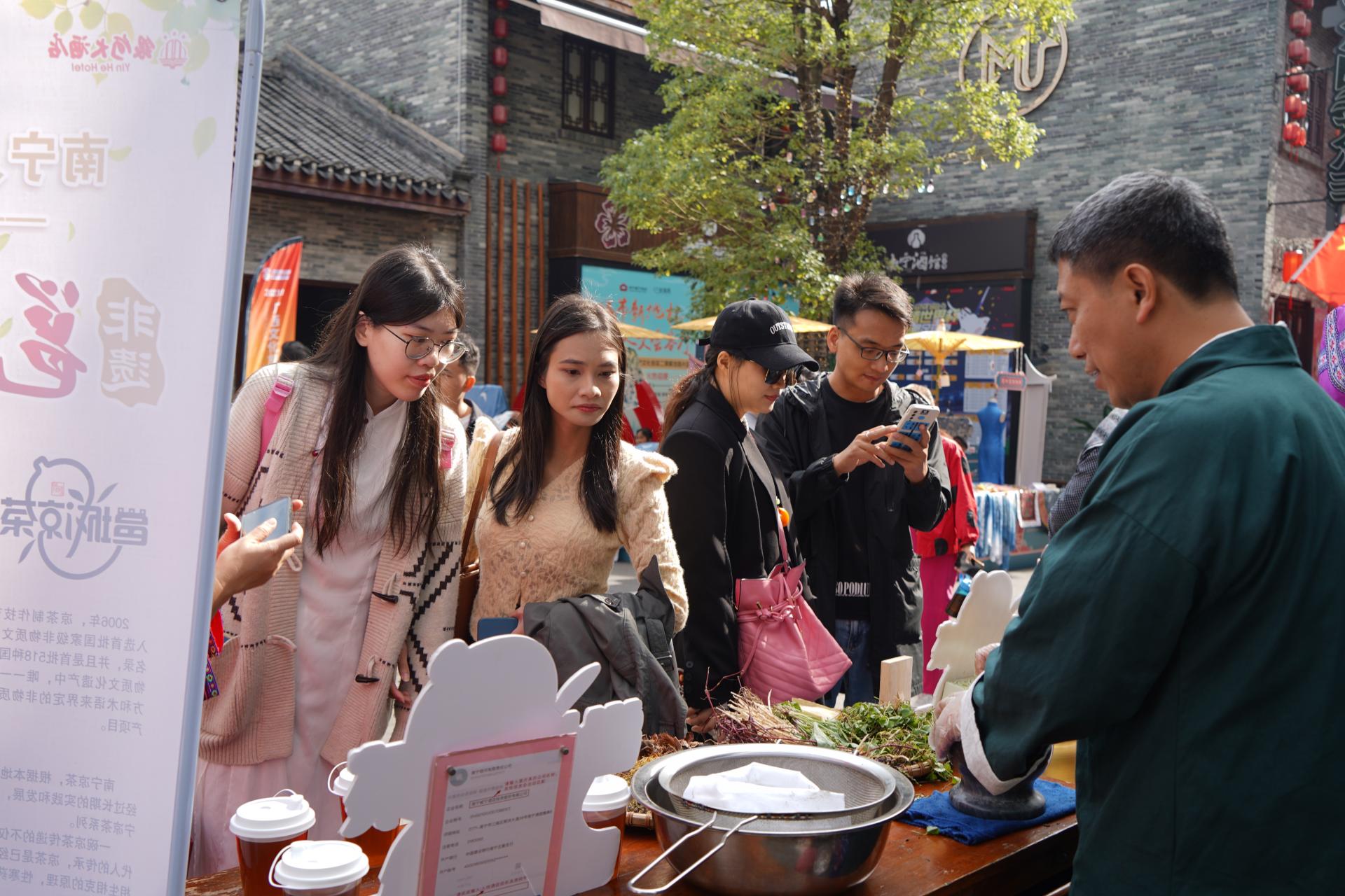 “這個品種的花叫什么,有什么功效?”“五花茶煲煮需要幾個小時?”“這款竹蔗馬蹄水茶喝起來非常的甘甜”……作為本次參加“非遺”項目特色展覽的唯一飲品類產品,銀河大酒店“邕城涼茶”一經展出就受到三街兩巷往來市民游客的關注。明目清肝茶、甘蔗馬蹄水、生沖雷公根、 潤肺止咳茶、五花茶……在陳列攤點上,銀河大酒店展示的口味豐富的涼茶產品讓人目不暇接,而“邕城涼茶制作技藝”傳承人——銀河大酒店餐廳經理黃沖,則用道地的“南寧白話”招呼往來的市民游客,生動講解“邕城涼茶”的各類功效,共同探尋“邕城涼茶”近50年的發展歷史和申遺歷程,開啟一段“沉浸式”涼茶時光穿梭之旅。