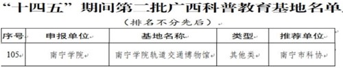 2023年8月31日,廣西壯族自治區(qū)科學(xué)技術(shù)協(xié)會(huì)發(fā)布《自治區(qū)科協(xié)關(guān)于認(rèn)定“十四五”期間第二批廣西科普教育基地的通知》,由南寧市科學(xué)技術(shù)協(xié)會(huì)推薦的“南寧學(xué)院軌道交通博物館”成功獲批,這是自今年6月12日,南寧學(xué)院獲批南寧市科普教育基地之后,成功獲批廣西壯族自治區(qū)科普教育基地,實(shí)現(xiàn)一年內(nèi)連續(xù)成功獲批市級(jí)和自治區(qū)級(jí)科普教育基地的重要突破。