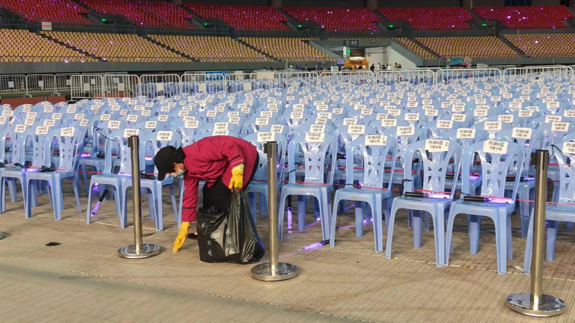 在演出籌備前夕,威凱智慧物業服務團隊累計出動120名保障人員對VIP區上萬張坐席搬運、擺放,“拉線”式調整讓場館內座椅排列有序。