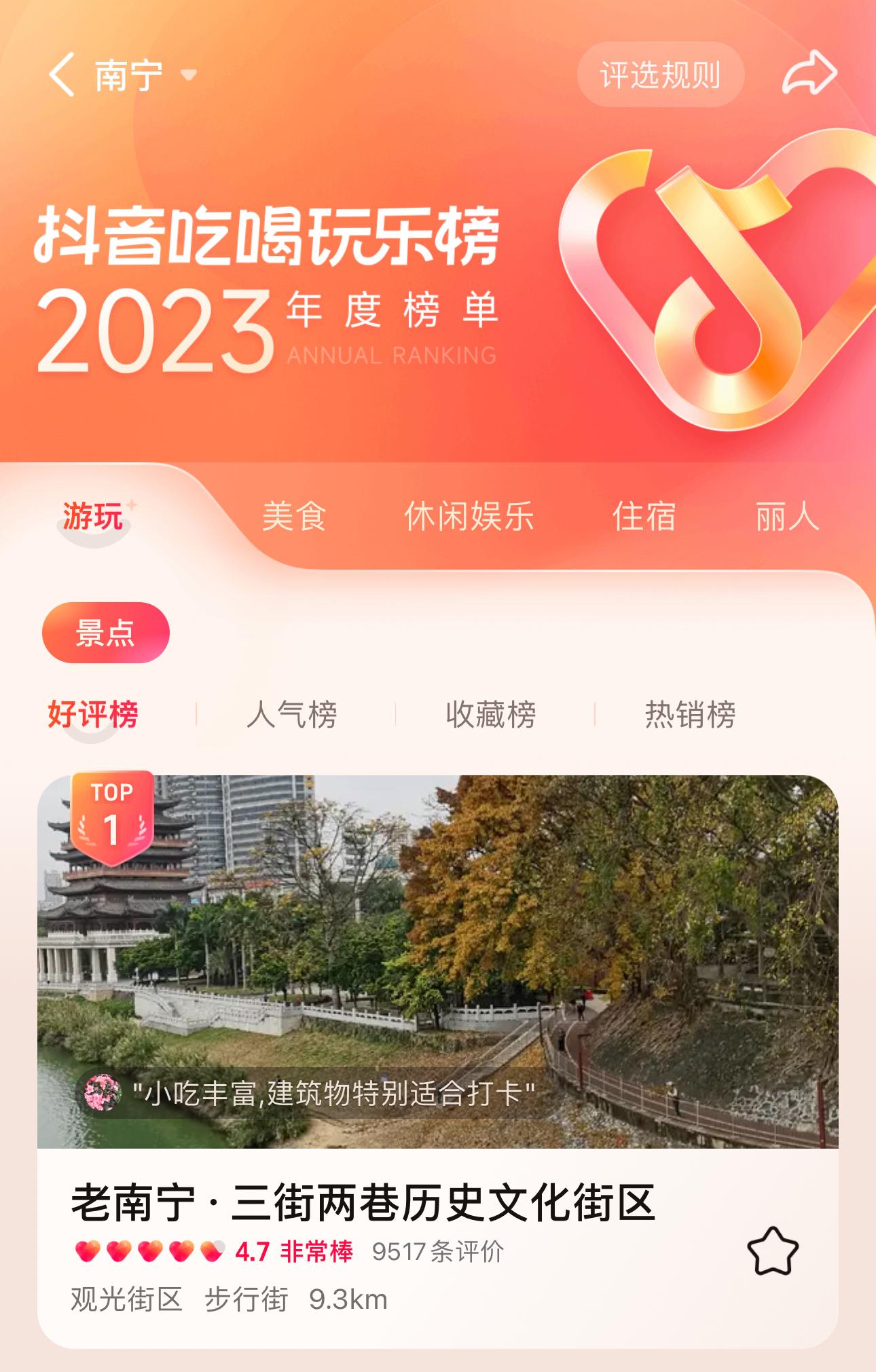近日,抖音平臺發(fā)布抖音吃喝玩樂榜2023年度榜單,該榜單是基于抖音休閑娛樂平臺大數(shù)據(jù),根據(jù)2023年度受歡迎的景區(qū)游玩人氣排名產(chǎn)生。由威邕城市運營集團運營的邕州古城·三街兩巷榮登2023年度吃喝玩樂榜南寧景區(qū)TOP1,再次印證邕州古城·三街兩巷作為南寧市商文旅融合新地標(biāo)所帶來的高人氣效應(yīng)。