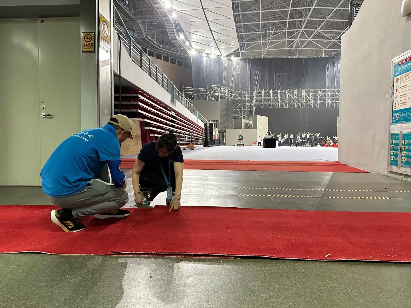 演唱會前在體育館鋪設紅地毯