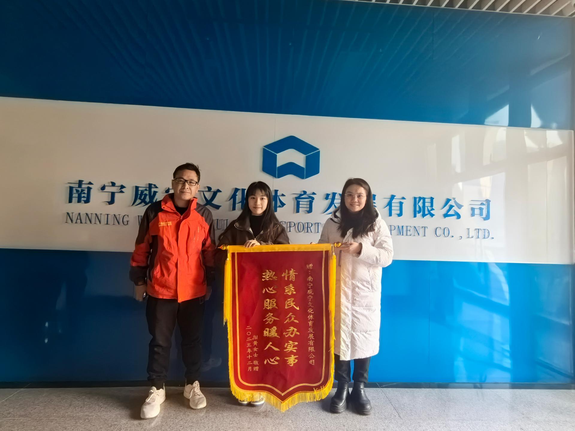 12月25日,一位在林俊杰演唱會上“失而復得”手機的觀眾給威寧文體公司送來一面錦旗,失主黃女士說,廣西體育中心給前來觀看演唱會的觀眾來帶溫暖貼心的服務,讓我們感受到在這里舉辦的活動非常安全且有保障,可以盡情享受演唱會的熱烈氣氛!
