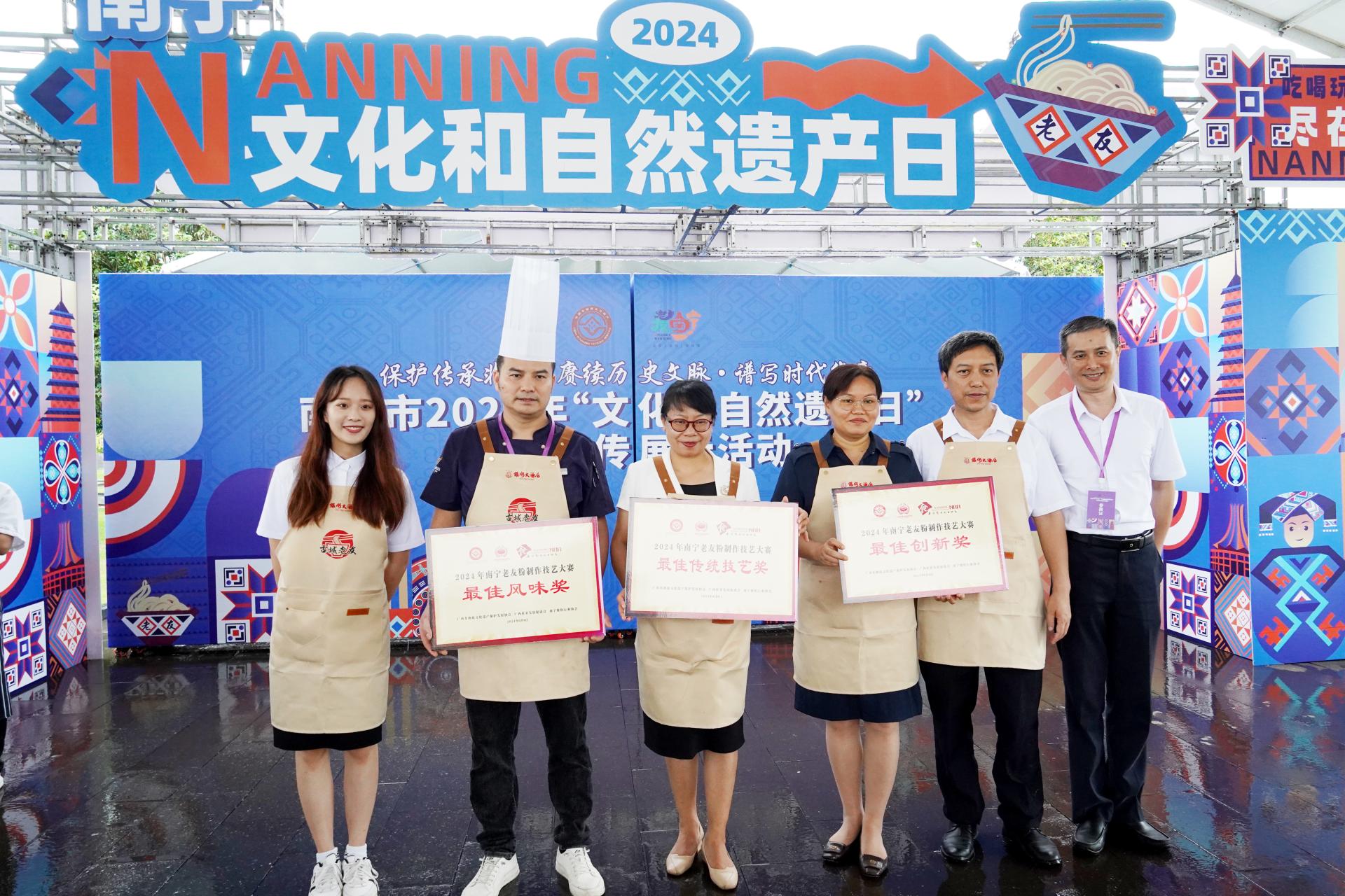 同時,在活動現場舉辦的南寧市2024年“文化和自然遺產日”南寧老友粉制作技藝大賽上,銀河大酒店以精湛的老友粉制作技藝和獨特的味道創新,贏得了評委和現場市民的喜愛,其中制作的“古城老友豬雜粉”榮獲“最佳創新獎”,“古城老友干撈粉”榮獲“最佳風味獎”,“古城老友炒粉”榮獲“最佳傳統技藝獎”。
