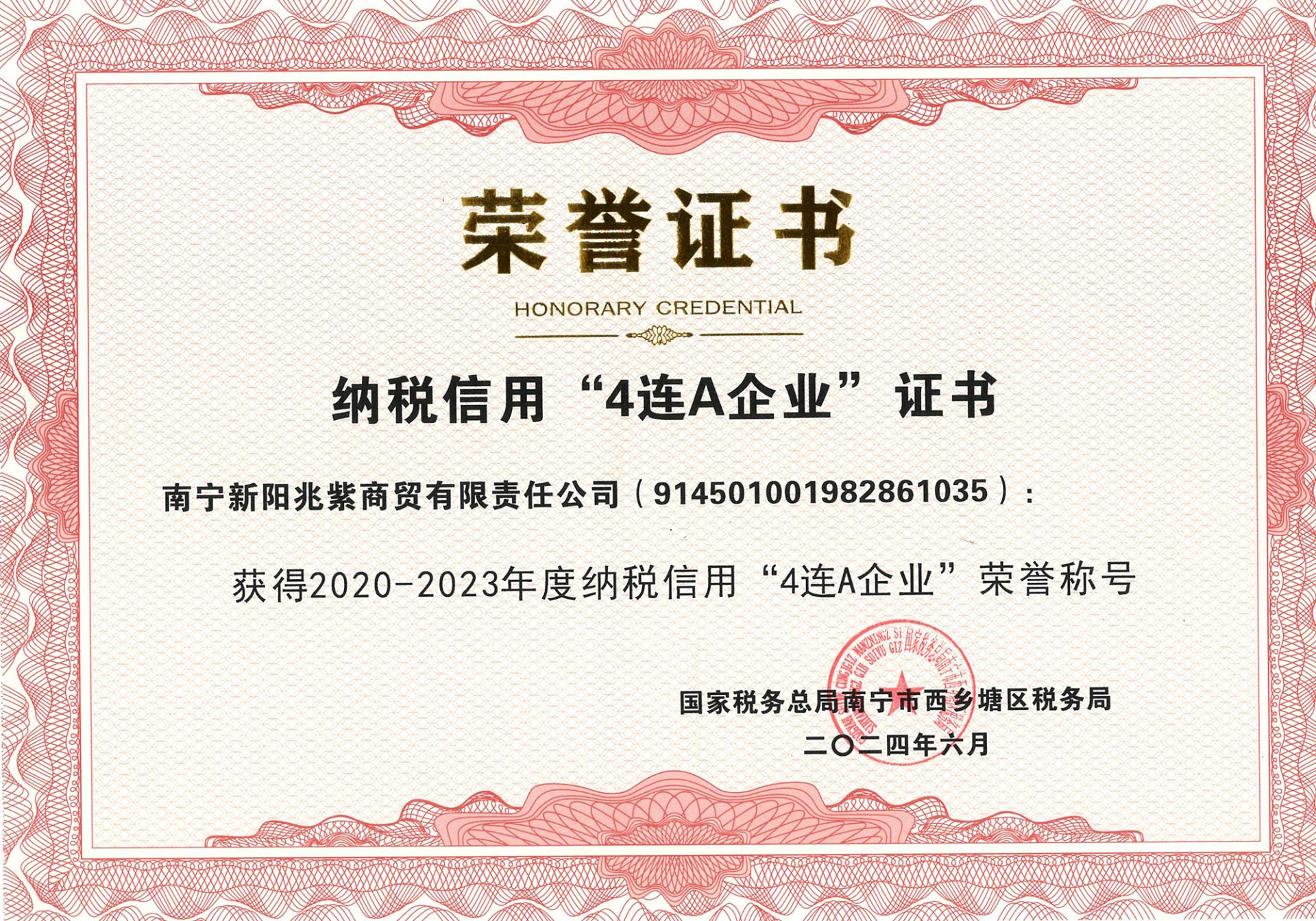 近日,威寧資產經營集團監管單位新陽兆紫商貿公司榮獲國家稅務總局南寧市西鄉塘區稅務局頒發的2020-2023年度納稅信用“4連A企業”榮譽稱號。