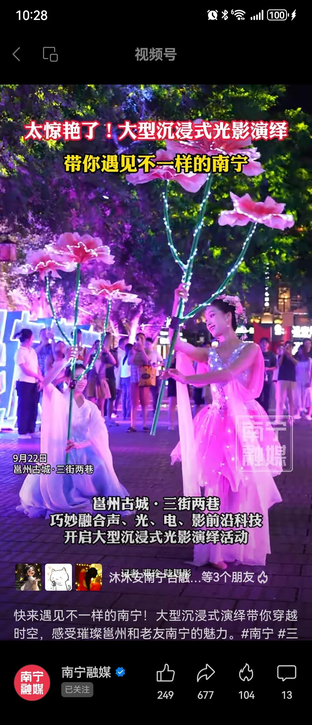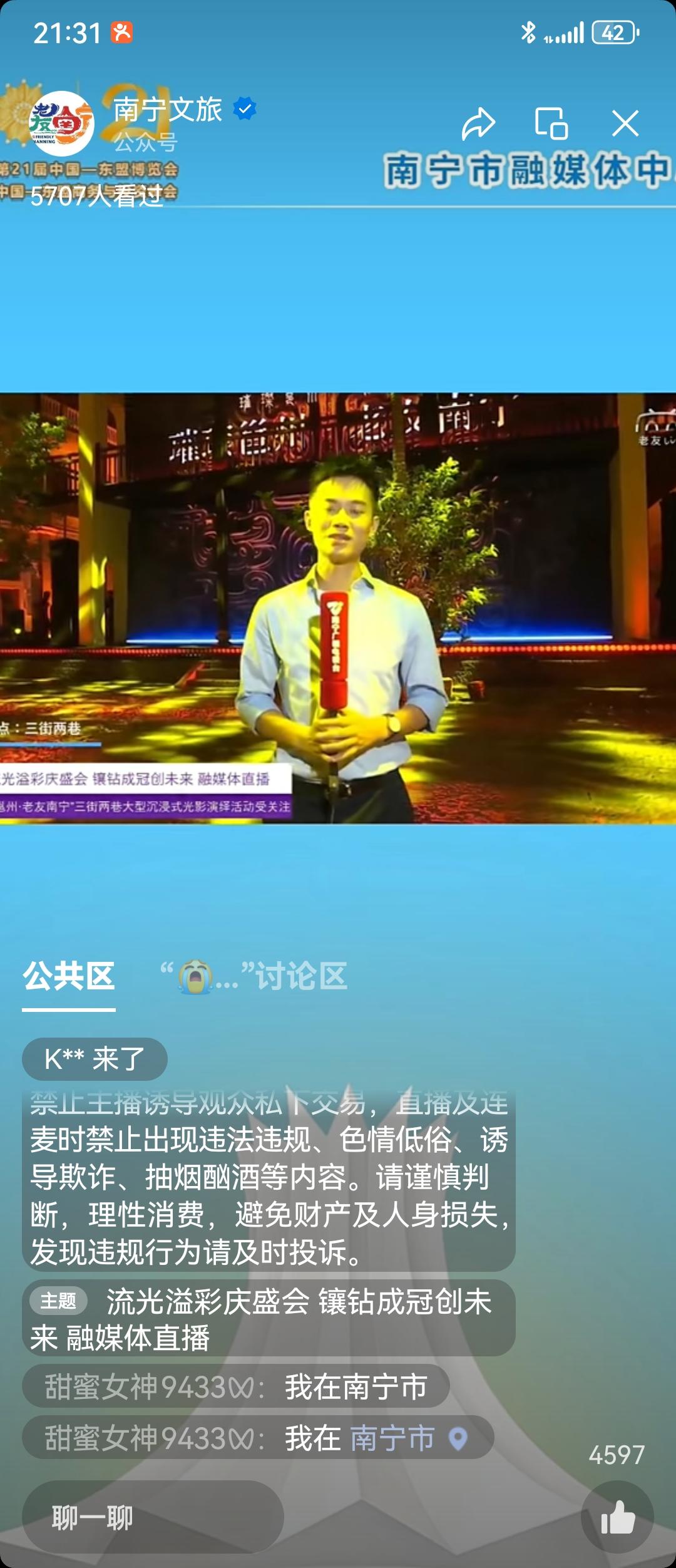 南寧市融媒新媒體平臺在活動期間,通過“南寧文旅”等多個官方新媒體賬號,對光影演繹活動進行了4場精彩的直播聯動。這些直播不僅讓觀眾能夠身臨其境地感受光影的震撼與美麗,還通過互動環節增強了觀眾的參與感與體驗感,進一步提升了活動的傳播力與影響力,讓“璀璨邕州·老友南寧”成為了東博會和峰會及國慶期間最耀眼的文化名片之一。在邕州古城·三街兩巷的抖音賬號,也分別在東博會和峰會期間和國慶節當天開通了兩場直播,通過兩場不同角度和主題的直播,既向廣大東盟和外地游客介紹了三街兩巷的參觀游覽路線,也著重展現了本次活動的精華演出,吸引了眾多網友線上觀看后,再來線下打卡。
