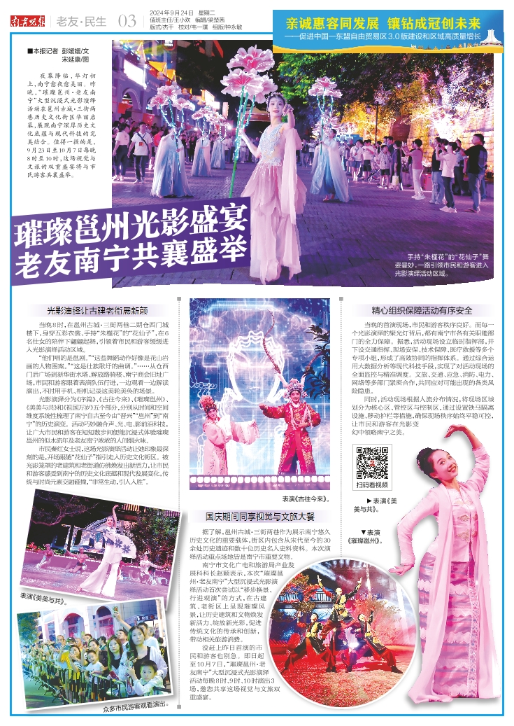 活動期間,廣西日報、南國早報、廣西廣播電視臺、南寧日報、南寧晚報、南寧廣播電視臺等12家媒體兩次派出記者,深入邕州古城·三街兩巷,用鏡頭捕捉這場光影交織的文化盛宴的精彩瞬間。他們不僅記錄了光影演繹的絕美畫面,還深入探訪了活動背后的故事,從活動籌備的辛勤汗水到技術創新的匠心獨運,再到觀眾們的熱烈反響,全方位、多角度地展現了活動的獨特魅力與深遠意義。