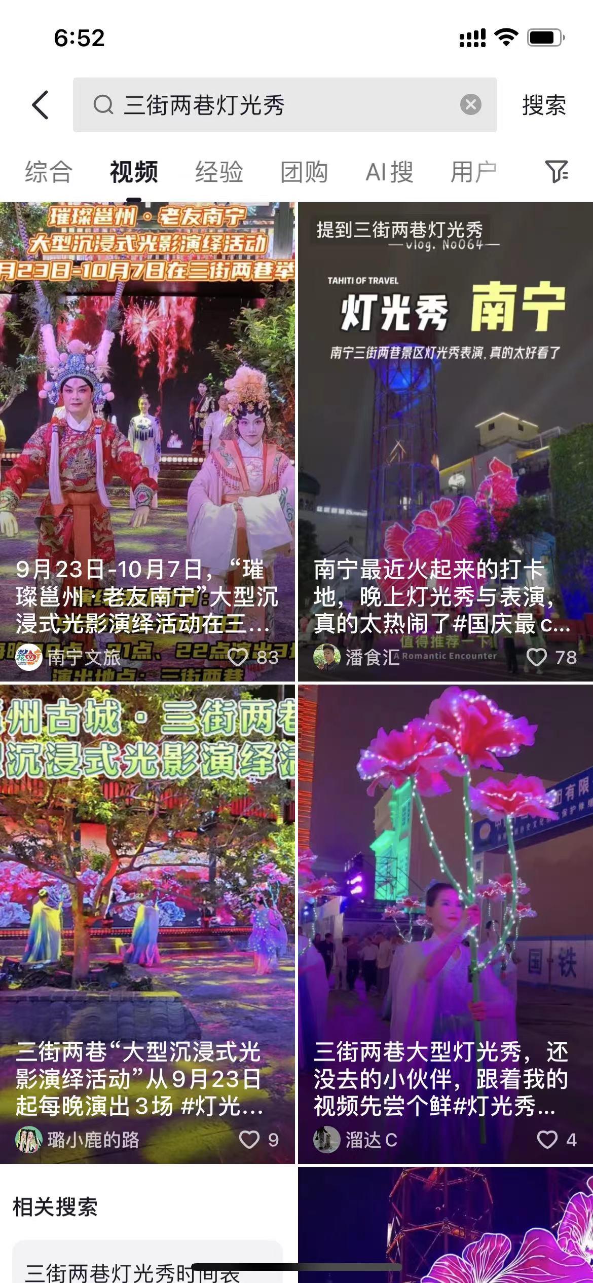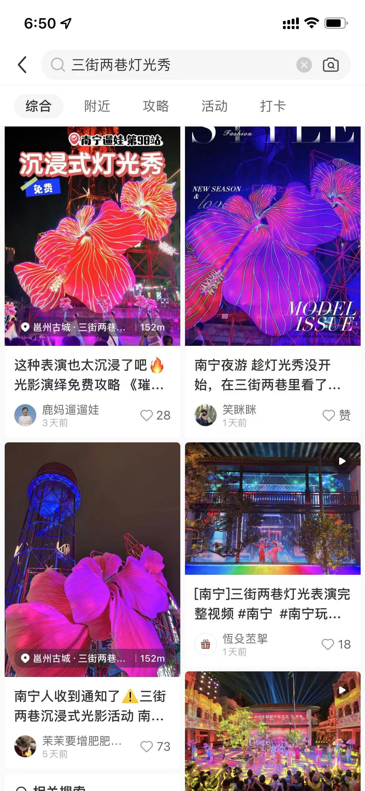 不僅如此,活動在同城媒體和來自全國游客觀眾上傳的各類現場視頻中,成為了南寧市民及游客熱議的焦點,“三街兩巷燈光秀”“國慶心動打卡地”“三街兩巷美麗夜景太迷人”等熱搜詞條和新華街水塔下巨型朱槿花、朱槿花仙子翩翩起舞巡游的畫面也持續刷屏,充分展現了活動在社交媒體上的高頻討論度。抖音達人“王同學”“超模CP”、自媒體賬號“識南寧”等紛紛上傳游玩打卡視頻,眾多素人博主也紛紛在抖音、小紅書等平臺上傳拍照打卡、領票攻略,通過一系列引人入勝的短視頻、圖文等形式分享自己的光影體驗之旅,進一步擴大了活動的影響力。截止活動結束,社交平臺上的相關話題討論量超過百萬次,視頻觀看量更是突破億級,讓“璀璨邕州·老友南寧”成為了國慶期間網絡上的熱門話題。