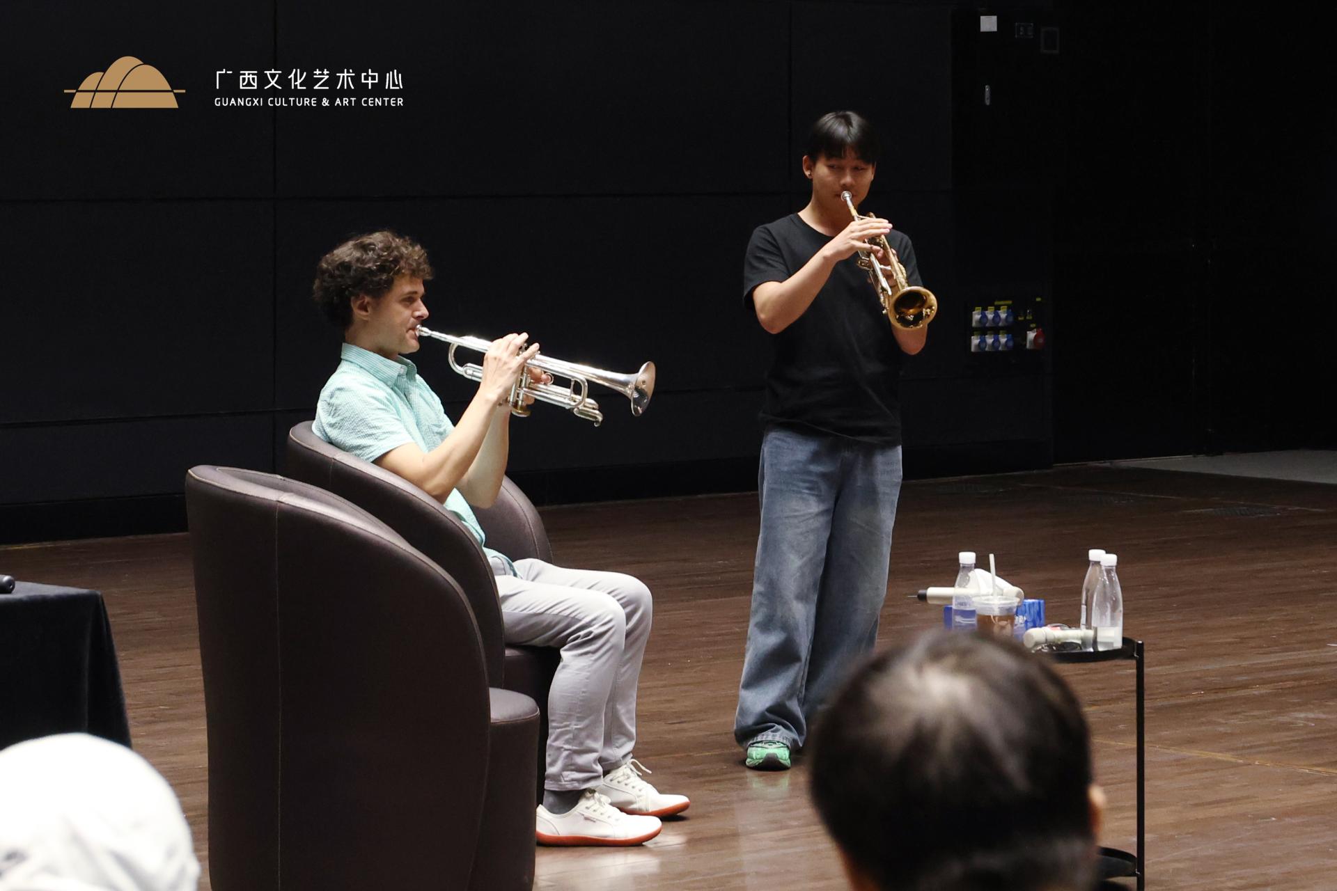 為踐行全民藝術(shù)普及、文化惠民、文化利民的服務(wù)宗旨,進(jìn)一步營(yíng)造濃厚的藝術(shù)文化氛圍,近日,廣西文化藝術(shù)中心在多功能廳組織開展“藝童成長(zhǎng)”小號(hào)公益分享交流會(huì),邀請(qǐng)前加拿大銅管五重奏成員法比奧·布魯姆現(xiàn)場(chǎng)分享樂曲心得。廣西藝術(shù)學(xué)院小號(hào)副教授曹天受邀擔(dān)任交流分享會(huì)的主持人,廣西文化藝術(shù)中心藝術(shù)團(tuán)師生、廣西藝術(shù)學(xué)院學(xué)生共30人參加。