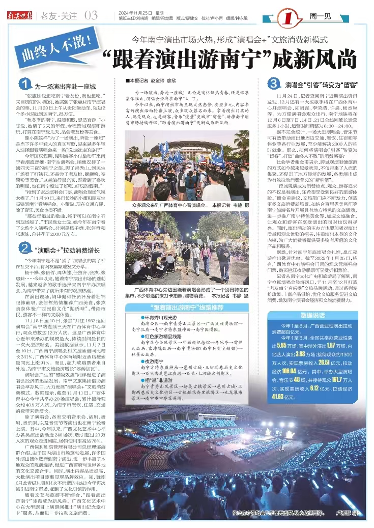 南寧創新“演唱會+文旅”消費新模式,2024年預計拉動經濟增長28.81億元。在這場城市文旅狂飆賽上,南寧文旅集團激流勇進,在廣西體育中心舉辦和申報的演唱會和音樂節活動共計28場。本次南寧周深演唱會不僅是音樂愛好者的盛宴,更是南寧文旅集團展示其助力南寧演唱會經濟、推動文旅體商融合發展的重要契機。通過邀請媒體參與此次媒體行活動,旨在深入宣傳南寧文旅集團的品牌形象,展示其在文旅產業發展中的新成就,進一步提升南寧市文旅品牌形象。