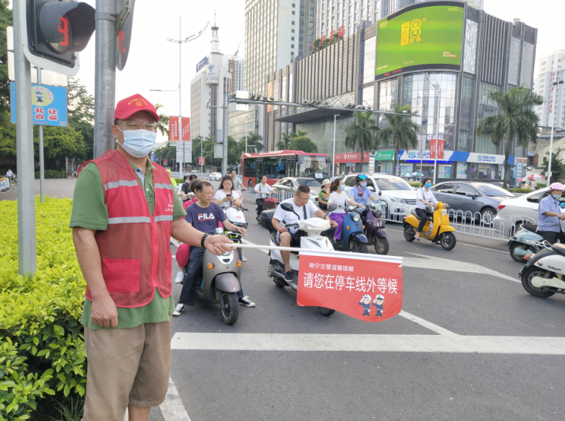 在開展創(chuàng)建文明城工作中,道路文明交通、公共秩序是城市文明的具體表現(xiàn),為充分發(fā)揮黨員志愿者模范帶頭作用,秉承志愿服務(wù)精神,助力南寧市創(chuàng)建全國文明城市的工作,連日來,五象山莊黨支部、生態(tài)園公司黨支部、銀河公司黨支部組織黨員在民族大道,開展文明交通勸導(dǎo)志愿服務(wù)活動。在交通勸導(dǎo)工作中,黨員志愿者亮身份、道文明、付行動,積極開展道路交通文明引導(dǎo),“你好,請退回停止線內(nèi)”、“你好,過馬路請走斑馬線……”。黨員志愿者們頭戴小紅帽、身穿紅馬夾、手持小旗子,在繁忙的交通路口,一遍又一遍重復(fù)著文明交通勸導(dǎo)的話語,在城市繁忙的交通路口形成了一道靚麗的風(fēng)景線。