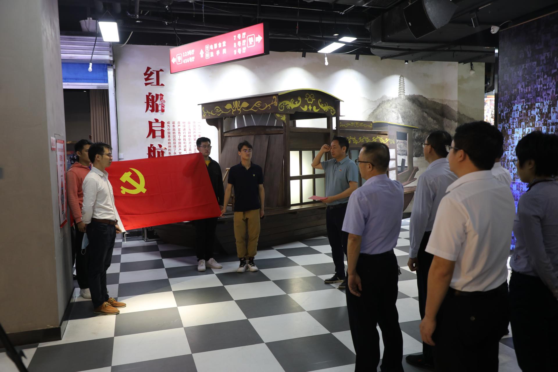 沉浸式黨課后,集團黨委副書記馬超毅到“嘉興紅船”劇情點,帶領全體黨員面向黨旗,重溫入黨誓詞。“我志愿加入中國共產黨,擁護黨的綱領,遵守黨的章程……為共產主義奮斗終身,隨時準備為黨和人民犧牲一切,永不叛黨。”鏗鏘有力的宣誓聲響徹大廳,久久回蕩。