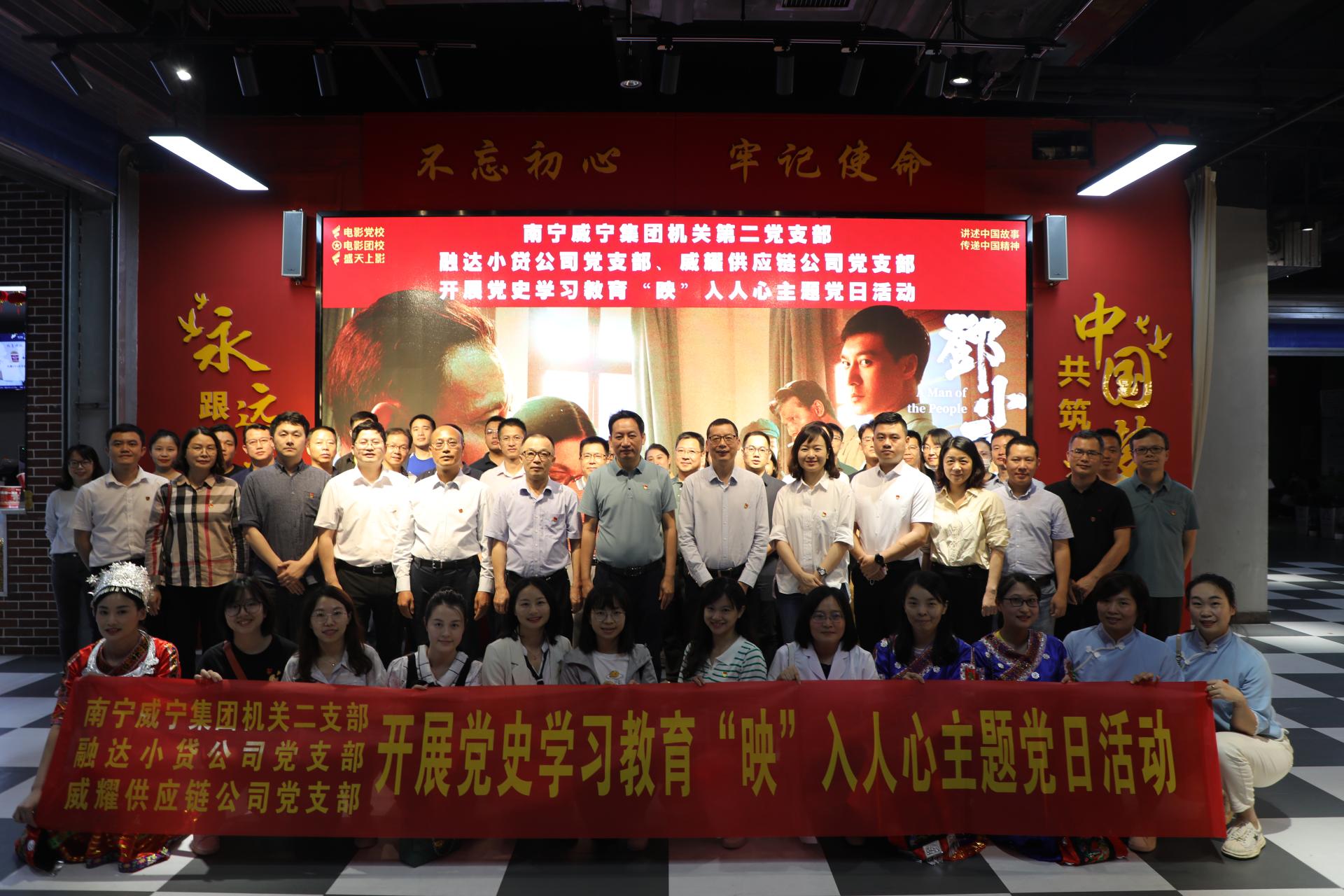 為進一步豐富黨建聯合方式、創新黨建工作載體和實質內容,不斷鞏固拓展黨史學習教育成果,2022年5月19日,南寧威寧集團機關第二黨支部、融達小貸公司黨支部、威耀供應鏈公司黨支部在兩新領域電影黨校暨盛天上影黨建教育基地聯合開展黨史學習教育“映”入人心主題活動。