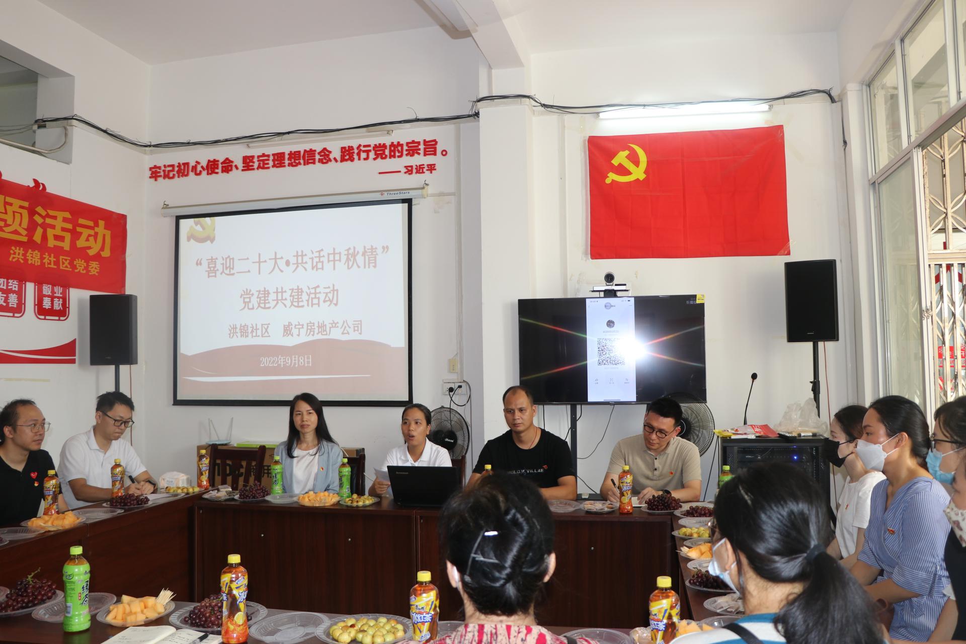 2022年9月8日上午,威寧房地產(chǎn)公司黨委與那洪街道洪錦社區(qū)黨委開(kāi)展“喜迎二十大?共話(huà)中秋情”黨建聯(lián)建系列活動(dòng),來(lái)自威寧房地產(chǎn)公司的黨員、社區(qū)黨員、志愿者代表和群眾代表共30多人參加活動(dòng)。