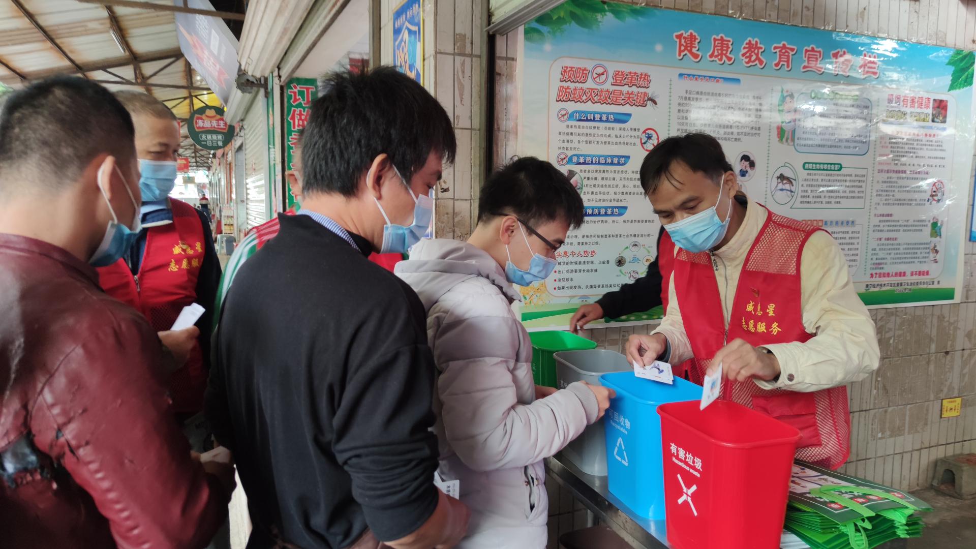 活動(dòng)現(xiàn)場(chǎng),黨員志愿者化身“生活垃圾分類(lèi)宣講員”,走攤?cè)脘佇麄髁私馐袌?chǎng)經(jīng)營(yíng)戶(hù)對(duì)垃圾分類(lèi)的意見(jiàn)建議,向前來(lái)市場(chǎng)購(gòu)物的市民顧客發(fā)放垃圾分類(lèi)宣傳冊(cè),講解生活垃圾的分類(lèi)類(lèi)別、投放方式以及有害垃圾的處理方法,同時(shí)開(kāi)展了垃圾分類(lèi)知識(shí)競(jìng)答、模擬投放益智游戲活動(dòng),通過(guò)寓教于樂(lè)的方式,號(hào)召大家積極學(xué)習(xí)、掌握分類(lèi)知識(shí),并正確引導(dǎo)身邊的人樹(shù)立垃圾分類(lèi)意識(shí)。