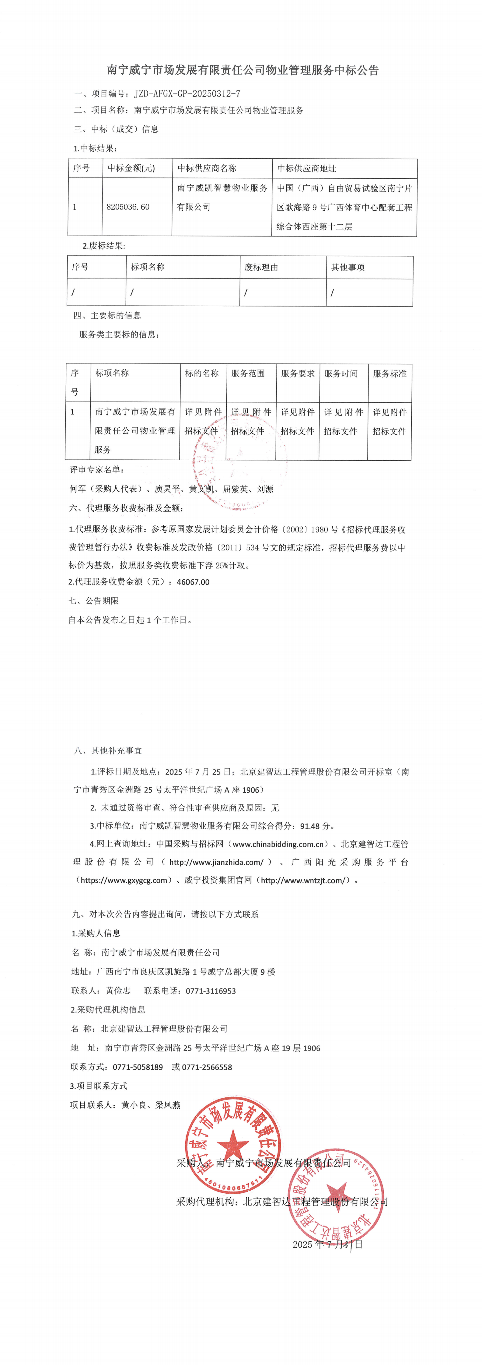 南寧威寧市場發展有限責任公司物業管理服務中標公告
