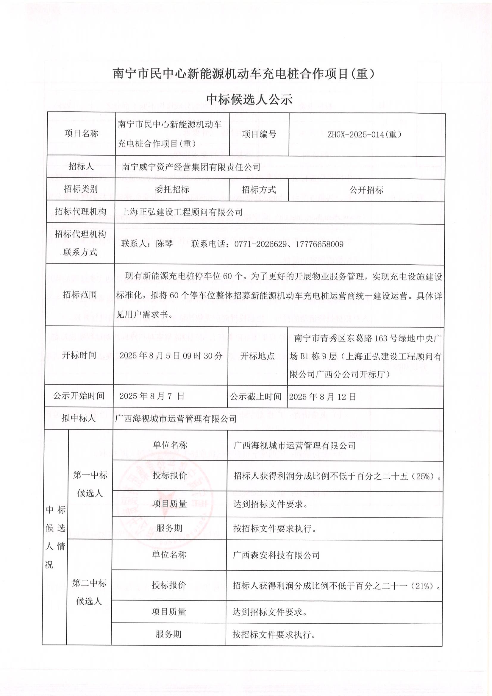 南寧市民中心新能源機動車充電樁合作項目中標候選人公示