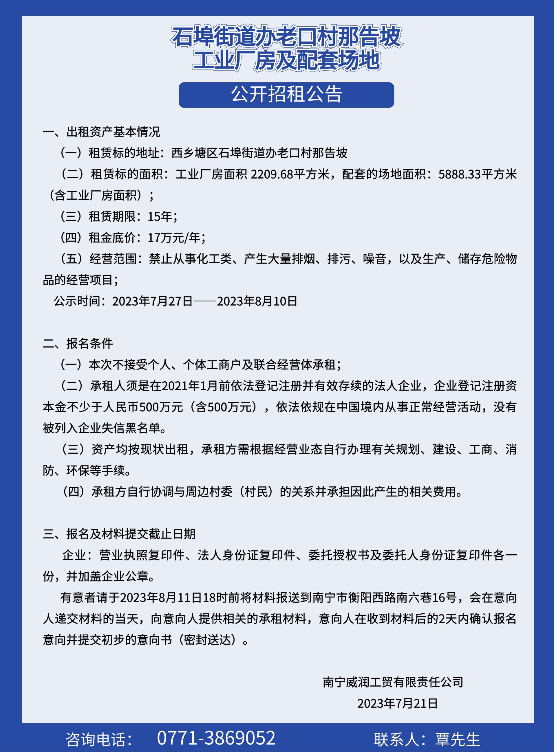 公開招租公告—石埠街道辦老口村那告坡工業廠房及配套場地