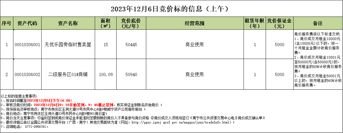 2023年12月6日競價標的信息