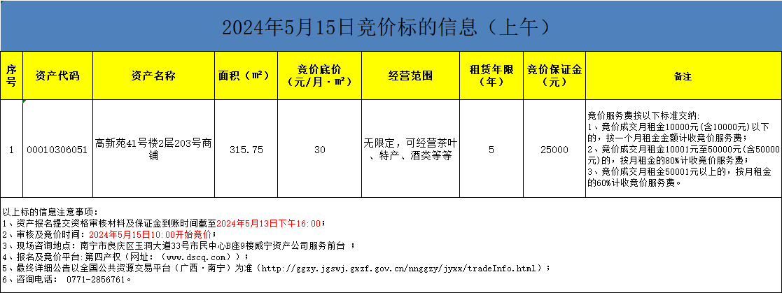 2024年5月15日競(jìng)價(jià)標(biāo)的信息(線上競(jìng)價(jià))