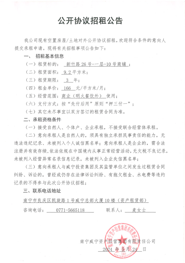 新竹路26號(hào)一層10號(hào)商鋪公開協(xié)議招租公告