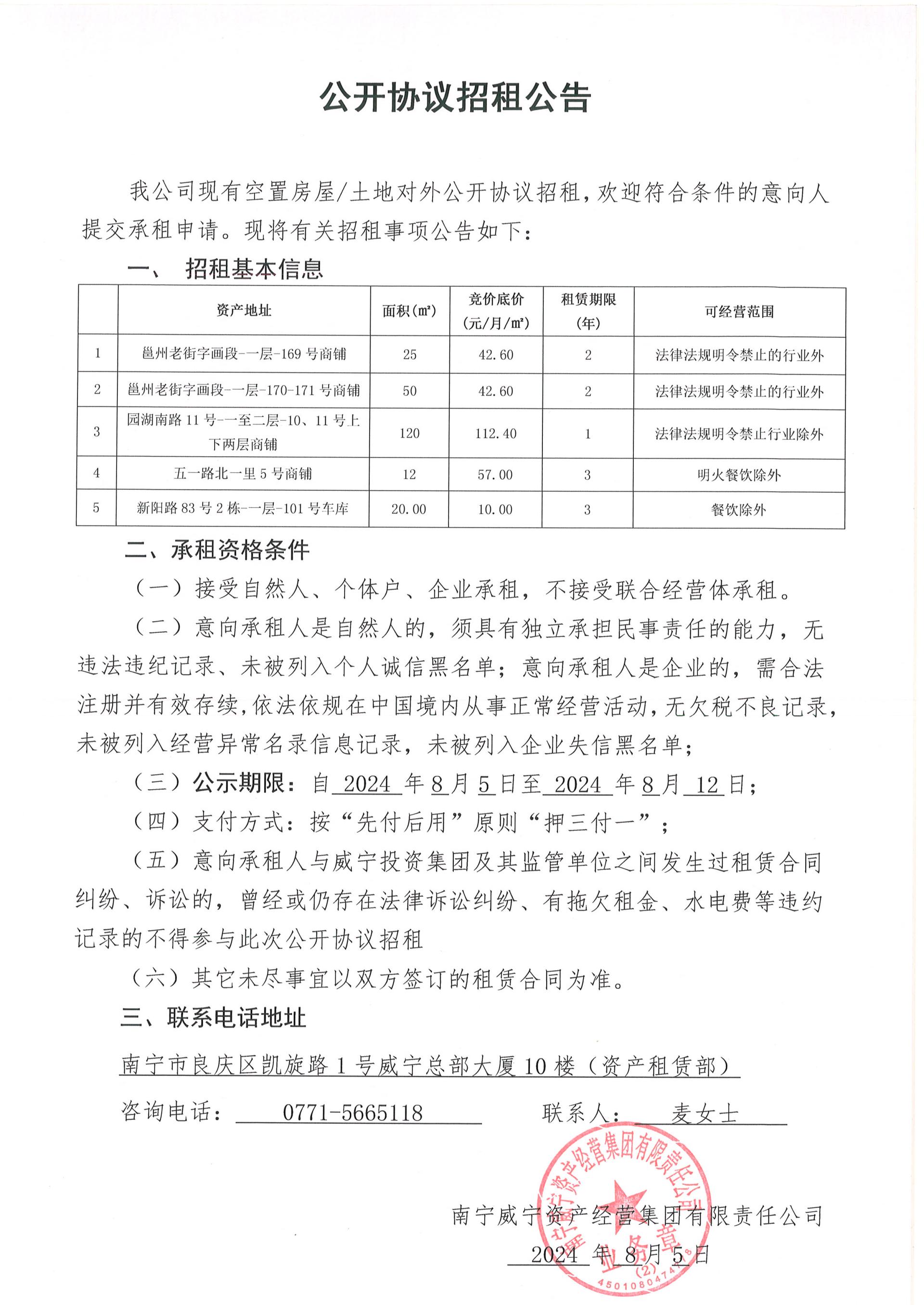 邕州老街、園湖南路、五一路、新陽路等資產(chǎn)公開協(xié)議招租公告