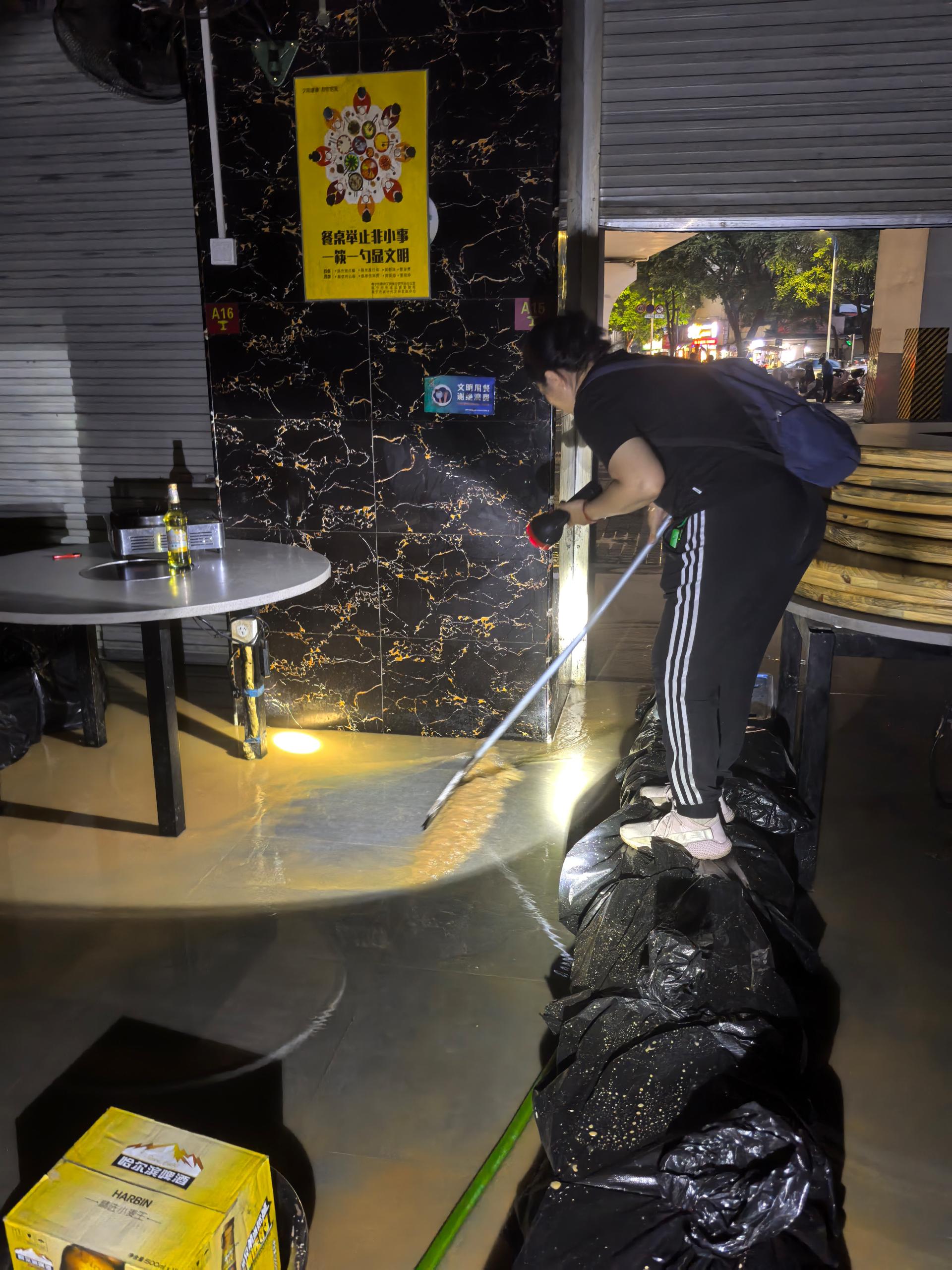 “我們再排查一遍!”為全天候監控所轄臨江鋪面漏水點,防汛應急小組開展集中調度,由唐宇昊和楊漾為首的突擊隊員們共分為2組開展24小時晝夜不舍的輪班排查,不間斷對商鋪漏水點進行現場勘查、標記,建立防汛應急搶險微信工作群,及時向南寧市邕江防洪排澇工程管理中心報告,做到“應急指令第一時間傳達到位,應急措施第一時間落實到位,現場險情情報第一時間掌握到位”。
