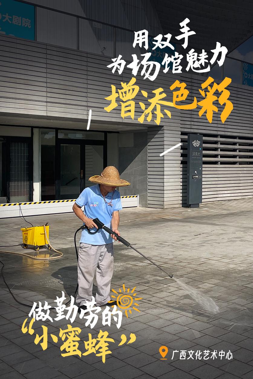 為保障場館環境衛生,廣西文化藝術中心環境服務團隊用細致的工作態度對公共區域完成衛生清潔,雖然灰塵與汗水沾滿臉頰,但依舊做到垃圾日產日清,場館整潔如新。