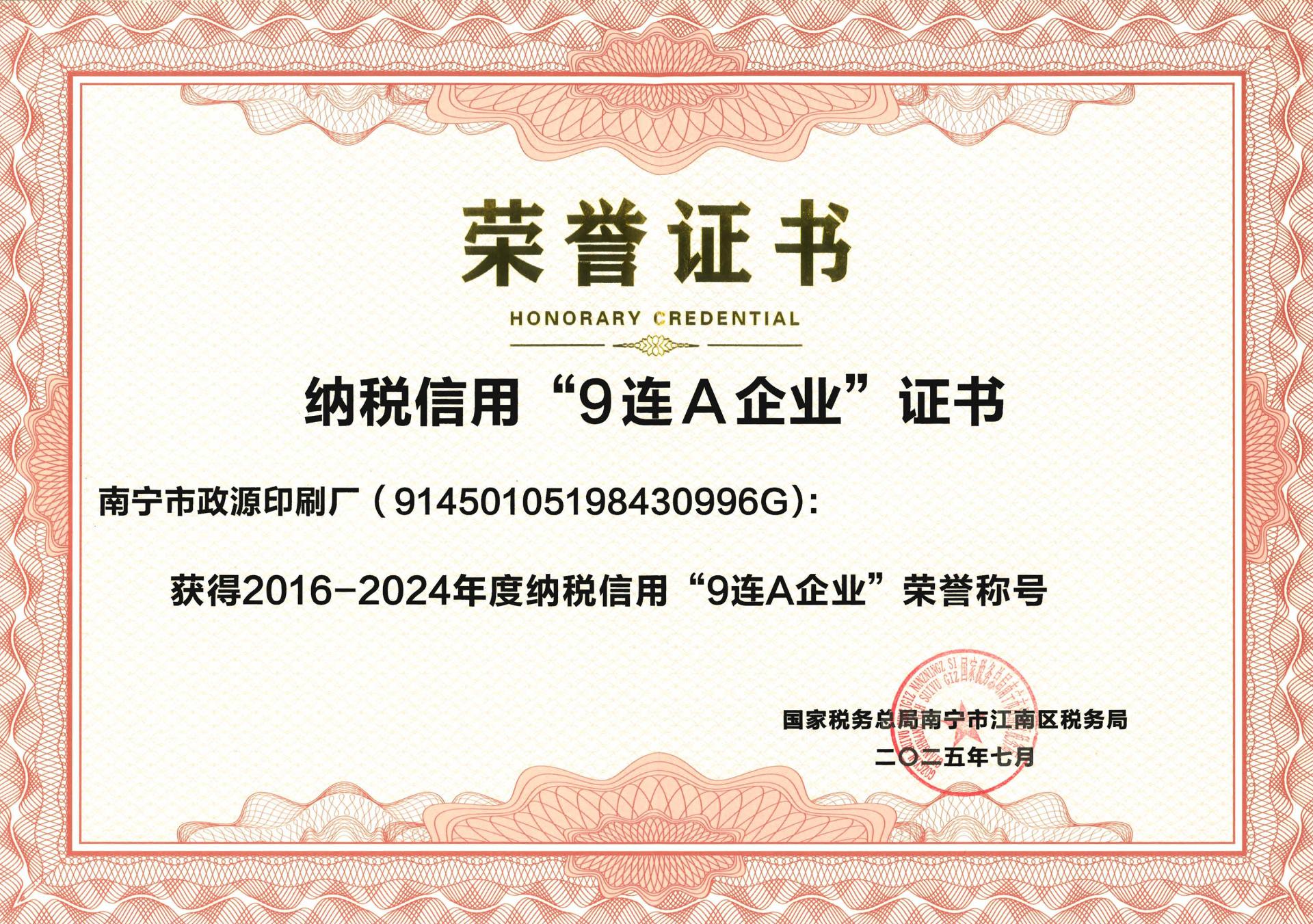 連續9年!南寧市政源印刷廠喜獲2016-2024年度納稅信用“9連A企業”榮譽稱號