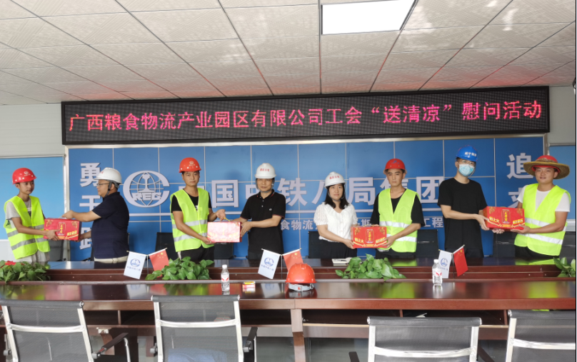 2020年8月28日,糧食園區公司副總經理林禮進代表公司工會到廣西(中國-東盟)糧食物流園區Ⅰ期項目地塊一主體施工現場開展“送清涼”慰問活動,為夏日堅守在園區項目一線的建筑工人送去清涼和關懷。