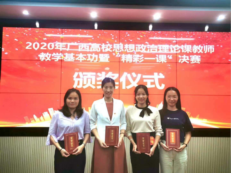 獲獎教師合影近日,自治區教育廳剛剛公布2020年廣西高校思想政治理論課教師教學基本功暨“精彩一課”比賽獲獎名單,南寧學院馬克思主義學院教師榮獲一等獎1名,二等獎1名,三等獎4名,實現了南寧學院參賽教師全部獲獎的喜人成績!為進一步提升全區高校思想政治理論課教師的教育教學能力,由自治區黨委教育工委、自治區教育廳主辦,廣西大學承辦的2020年廣西高校思想政治理論課教師教學基本功暨“精彩一課”比賽,自6月