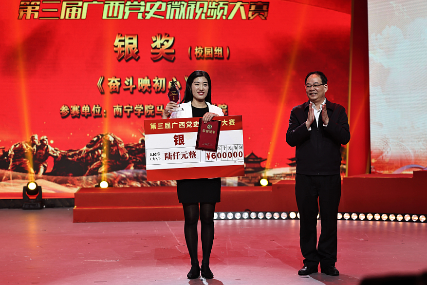 獲獎代表上臺領獎頒獎現場合影近日,“信仰伴我成長”第三屆廣西黨史微視頻大賽頒獎典禮在南寧舉行,南寧學院選送的作品《奮斗映初心》獲得校園組銀獎的好成績。“信仰伴我成長”第三屆廣西黨史微視頻大賽由廣西壯族自治區黨委黨史研究室、廣西壯族自治區文化和旅游廳、廣西廣播電視臺聯合主辦,主要以制作微視頻、微紀錄為創作方向,通過 “新媒體矩陣”活動平臺廣泛宣傳傳播。大賽主題圍繞廣西黨史上的事件、人物,結合當下抗擊