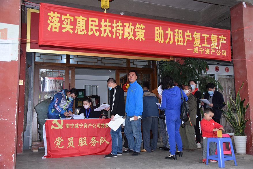 復(fù)工復(fù)產(chǎn)政策指導(dǎo)辦理不動產(chǎn)權(quán)證自新冠疫情發(fā)生以來,威寧資產(chǎn)公司在南寧市委市政府以及市國資委、南寧威寧集團(tuán)大力來支持下,積極響應(yīng)國家“六穩(wěn)”“六保”號召,堅持以務(wù)實高效的工作作風(fēng)詮釋使命擔(dān)當(dāng),全面履行國有企業(yè)的經(jīng)濟(jì)責(zé)任、政治責(zé)任和社會責(zé)任,為奪取疫情防控和經(jīng)濟(jì)社會發(fā)展雙勝利貢獻(xiàn)力量。內(nèi)外齊力,減租免租顯擔(dān)當(dāng)。受新冠肺炎疫情影響,不少承租商戶延遲復(fù)工時間,租金支出壓力巨大。面對疫情,公司黨委要求業(yè)務(wù)部
