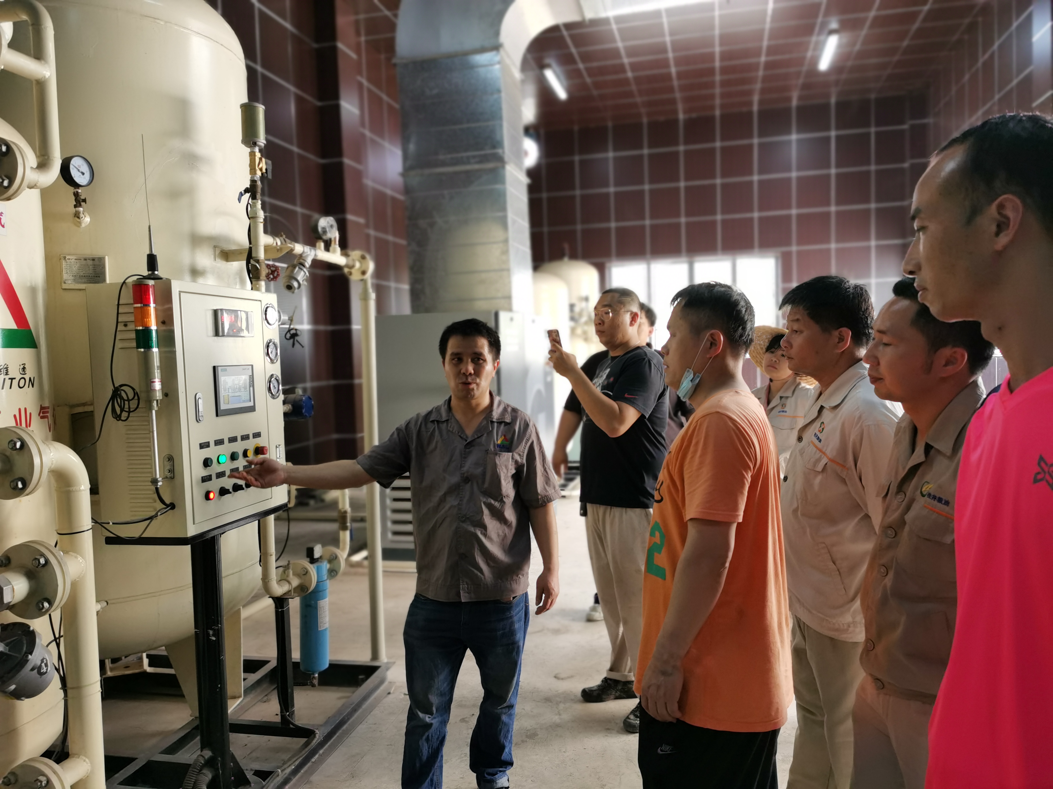 培訓現場糧庫工作人員在查看充氮設備罐體分離篩工作情況“我們這套制氮機組具有氮氣濃度自動檢測、設備故障提示報警等功能,操作人員在系統軟件中設定目標倉房需達到的氮氣濃度值、壓力值等參數……”近日,南寧威寧集團下轄威寧市場公司的儲備糧公司五象糧庫,組織進行充氮氣調設備機組安全檢查和維護保養,并借此機會邀請維護設備的技術人員對倉儲科全體員工開展充氮氣調設備安全操作實踐培訓。培訓中,技術人員就充氮氣調設備的