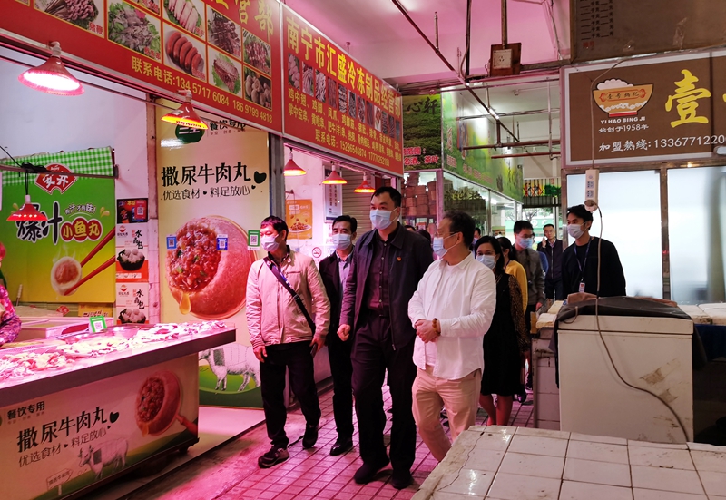 圖檢查現場2021年4月8日,南寧市西鄉塘區人民政府代區長韋翯鈺到威寧市場公司所屬的水街市場開展爭創全國文明典范城市、迎接全國衛生城市復審工作指導。韋翯鈺深入市場各行業,實地感受創建全國文明城市、全國衛生城市宣傳氛圍,仔細聽取市場負責人關于水街市場經營管理、衛生清潔和消防安全等工作開展情況的介紹,并詳細詢問市場肉類、水產品、燒鹵熟食等食品價格、進貨渠道及供需情況,重點查看農貿市場豬肉檔動物檢疫合格