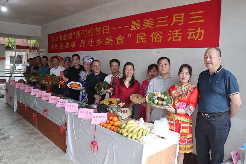 圖活動現場圖 壯家員工韋雨波分享民族美食2021年4月12日中午,威寧市場公司商業事業部組織壯、漢族職工代表,開展三月三民俗文化活動,弘揚壯鄉傳統民族文化。活動現場,來自各部門的“阿哥”和“阿妹”們,身穿壯族特色服裝歡聚一堂,壯族員工江桂寧和陳倩卿分享了壯族民間傳統故事《百鳥衣》《月亮妹》。員工們拿出親手烹飪的民族特色美食進行比拼,五色糯米飯、艾葉糍粑、油茶……,一道道精心制作的家鄉菜,將民族文化
