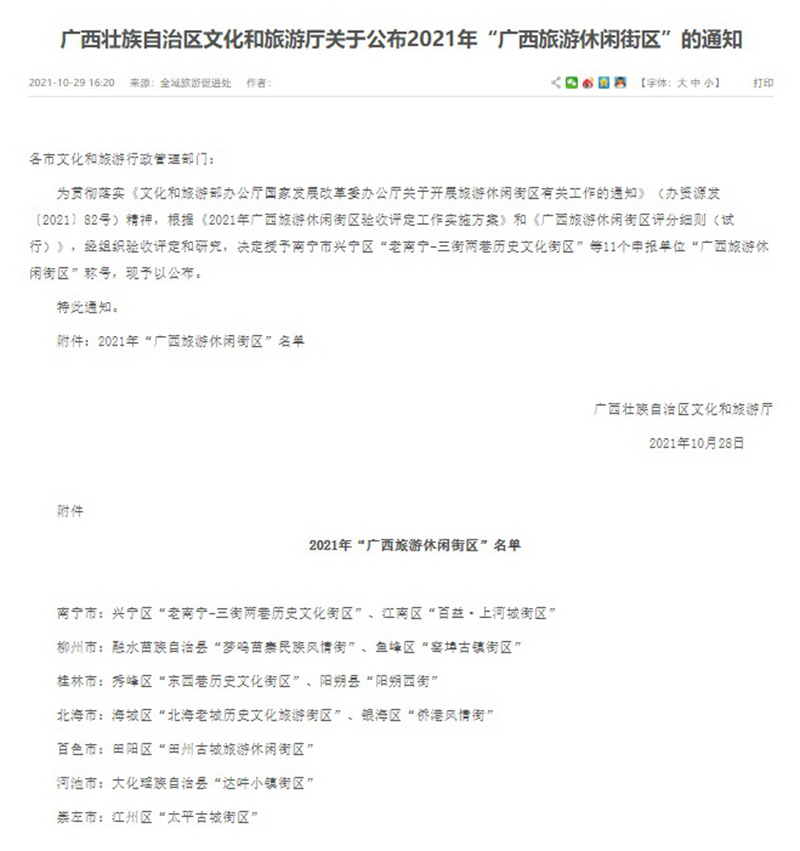 近日,廣西壯族自治區文旅廳公布2021年“廣西旅游休閑街區”名單,“老南寧·三街兩巷”歷史文化街區等11個項目成功入選。