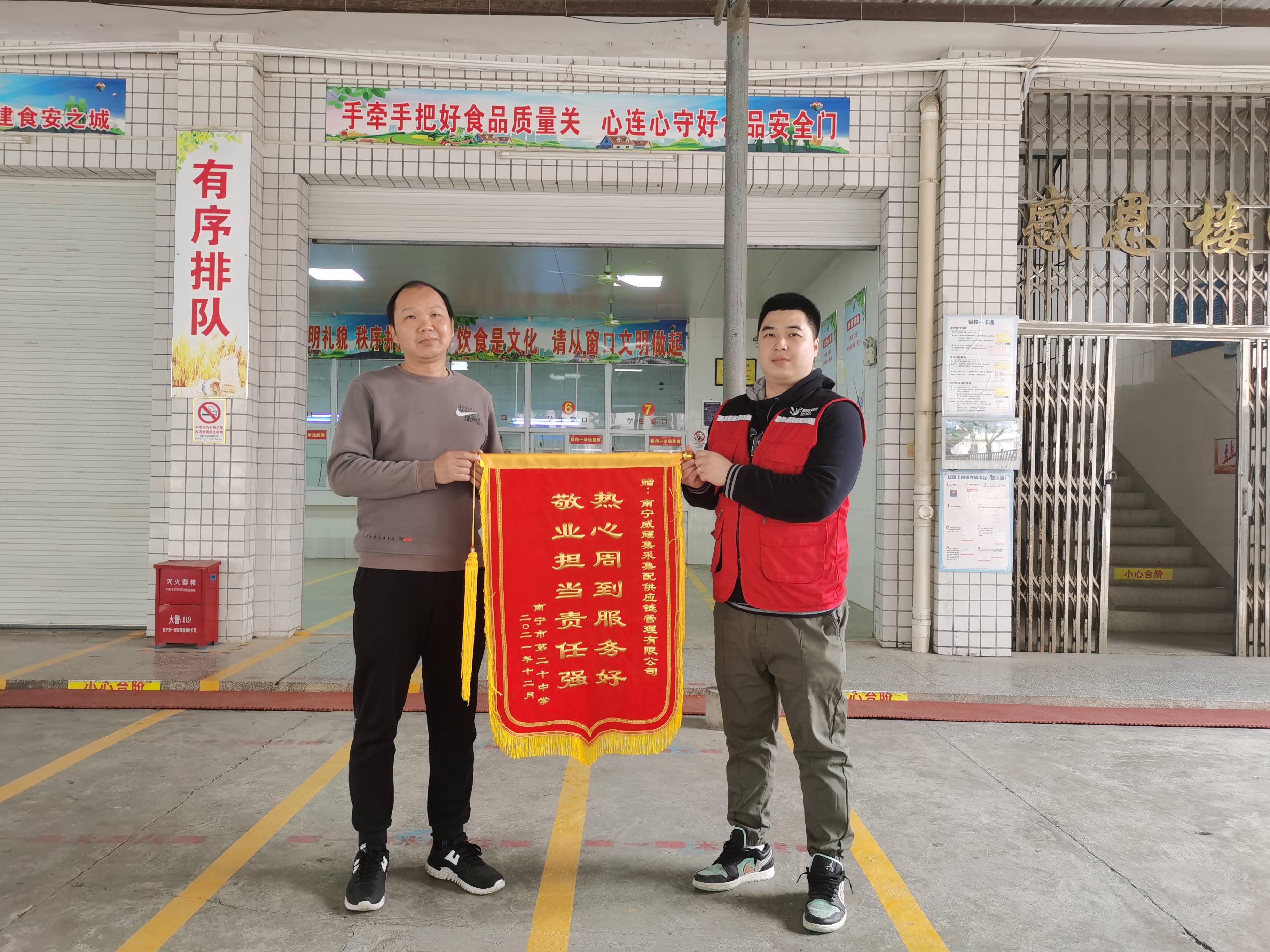 “熱心周到服務(wù)好,敬業(yè)擔(dān)當(dāng)責(zé)任強(qiáng)”“為學(xué)校貼心服務(wù),為安全保駕護(hù)航”。近日,南寧市第二十中學(xué)、南寧市江南區(qū)江西中學(xué)分別將兩面錦旗,送到了威耀供應(yīng)鏈公司為學(xué)校配備的專屬客服陸泰廷、覃福陽手中。這是威耀供應(yīng)鏈公司服務(wù)學(xué)校一載以來,收獲來自學(xué)校的最暖心的肯定。南寧市第二十中學(xué)黃副校長表示,自今年三月威耀供應(yīng)鏈公司正式為學(xué)校提供食材配送后,高效、優(yōu)質(zhì)的專屬客戶服務(wù),不僅解決了學(xué)校食材采購問題,還解決了學(xué)校